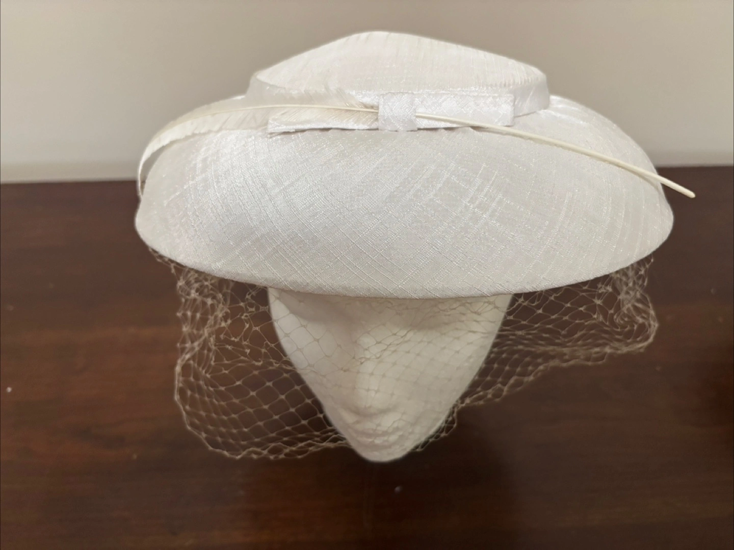This is a lovely white hat, perfect for a formal occasion. It features delicate netting and a subtle design. It is in great condition and ready to wear to your next special event!