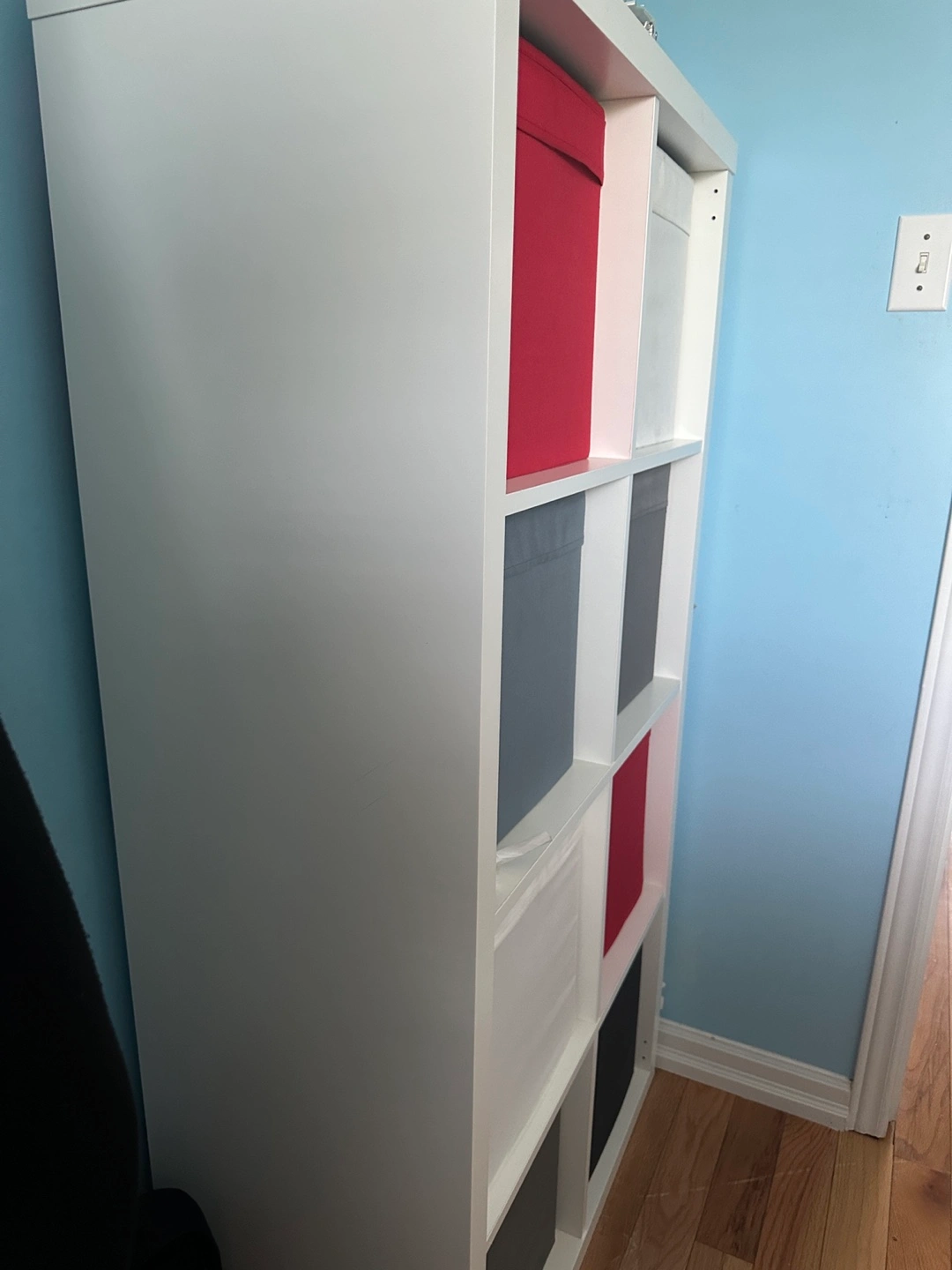 81Selling a white IKEA Kallax shelf unit. It's in good condition and ready for a new home! This unit is super versatile and great for organizing books, toys, or anything you need to store. The shelves are in a mix of red, white and grey colour.