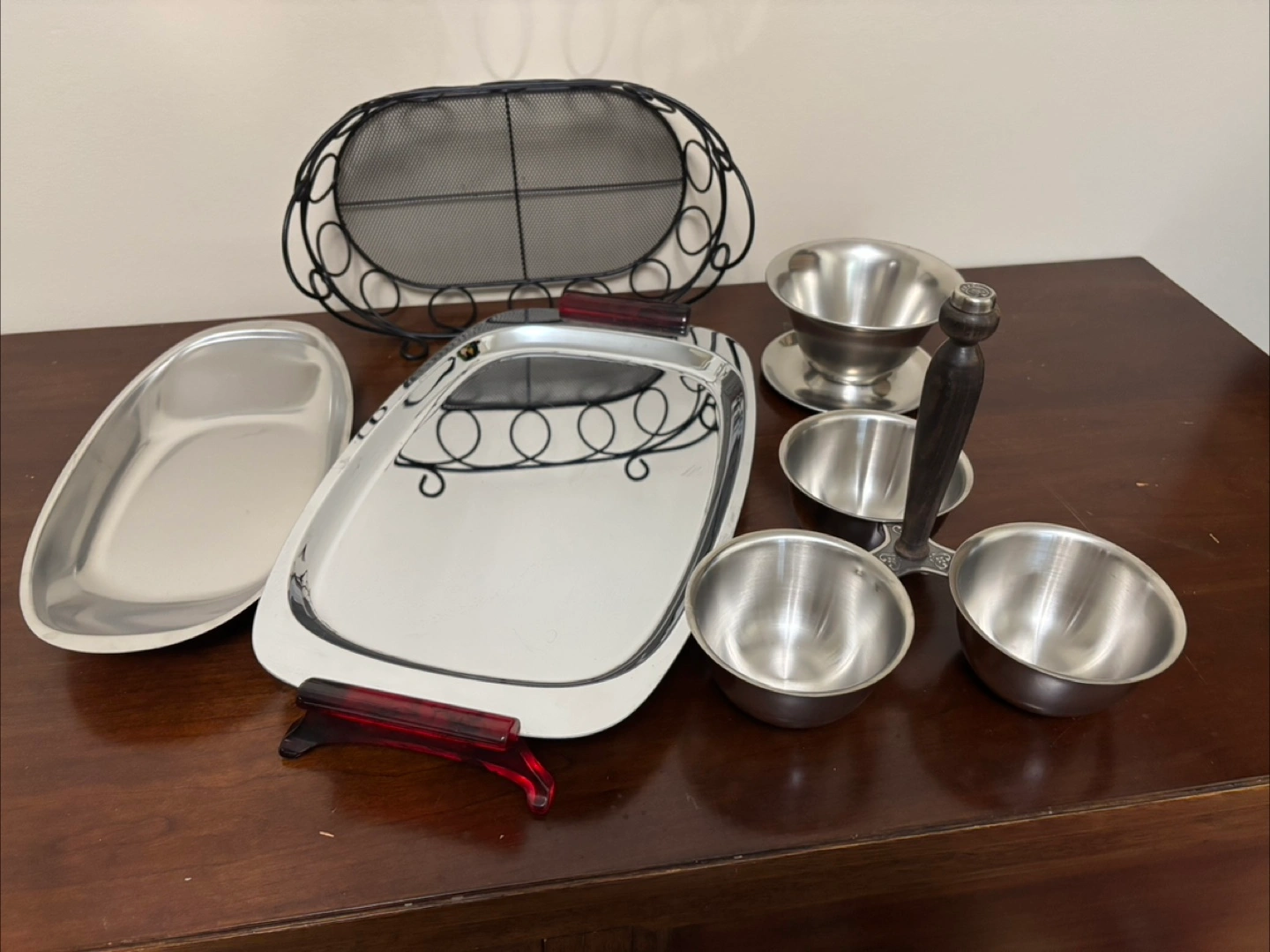 Selling a vintage stainless steel serving set. Includes various trays, bowls, and a handled serving piece. Great for entertaining or adding a retro touch to your kitchen!