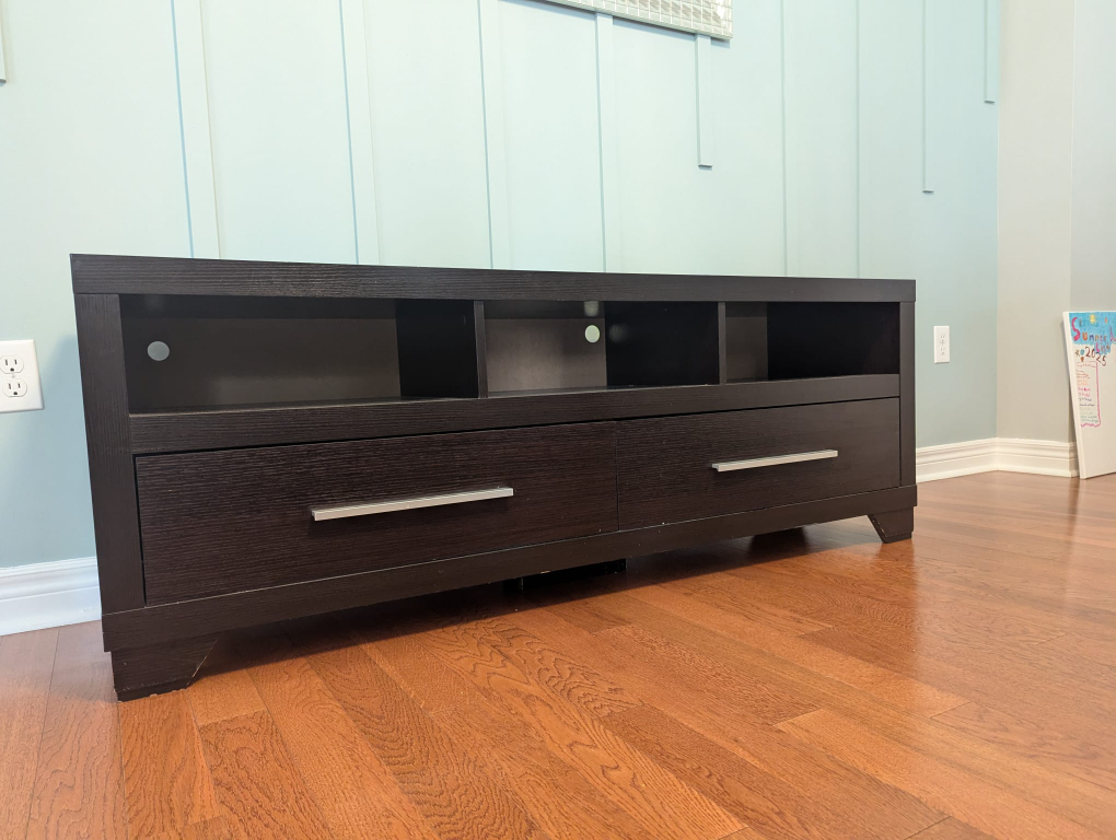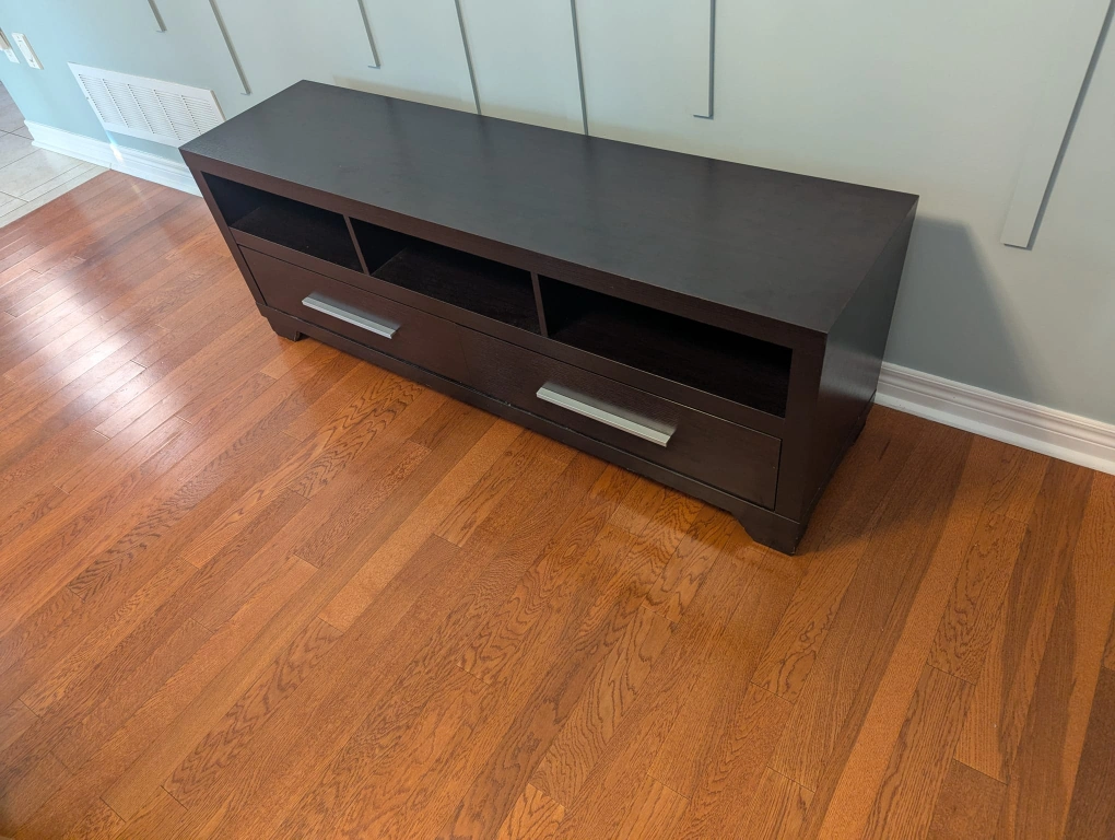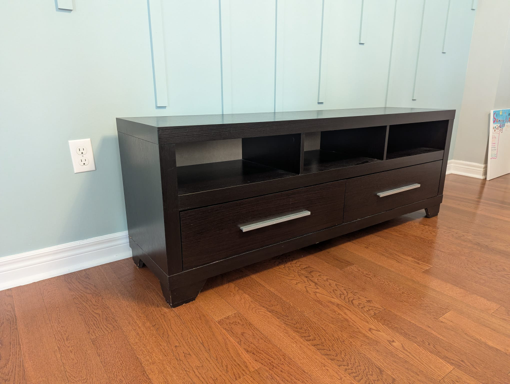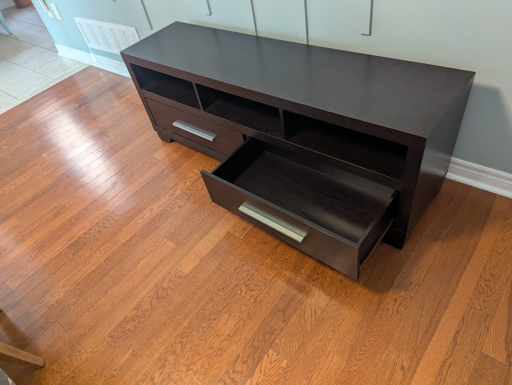 Selling a dark brown TV stand bought from the Brick! It has plenty of storage with open shelves and drawers. Perfect for organizing your media and accessories. It's in great condition and ready for a new home!