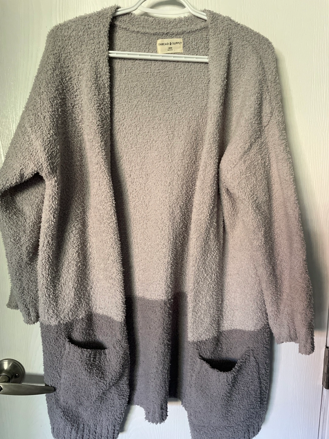 Selling a brand new super cozy cardigan from Thread & Supply! It's a one-size-fits-most (OSFM) and features a lovely two-tone grey colour block design. Perfect for layering on chilly days!