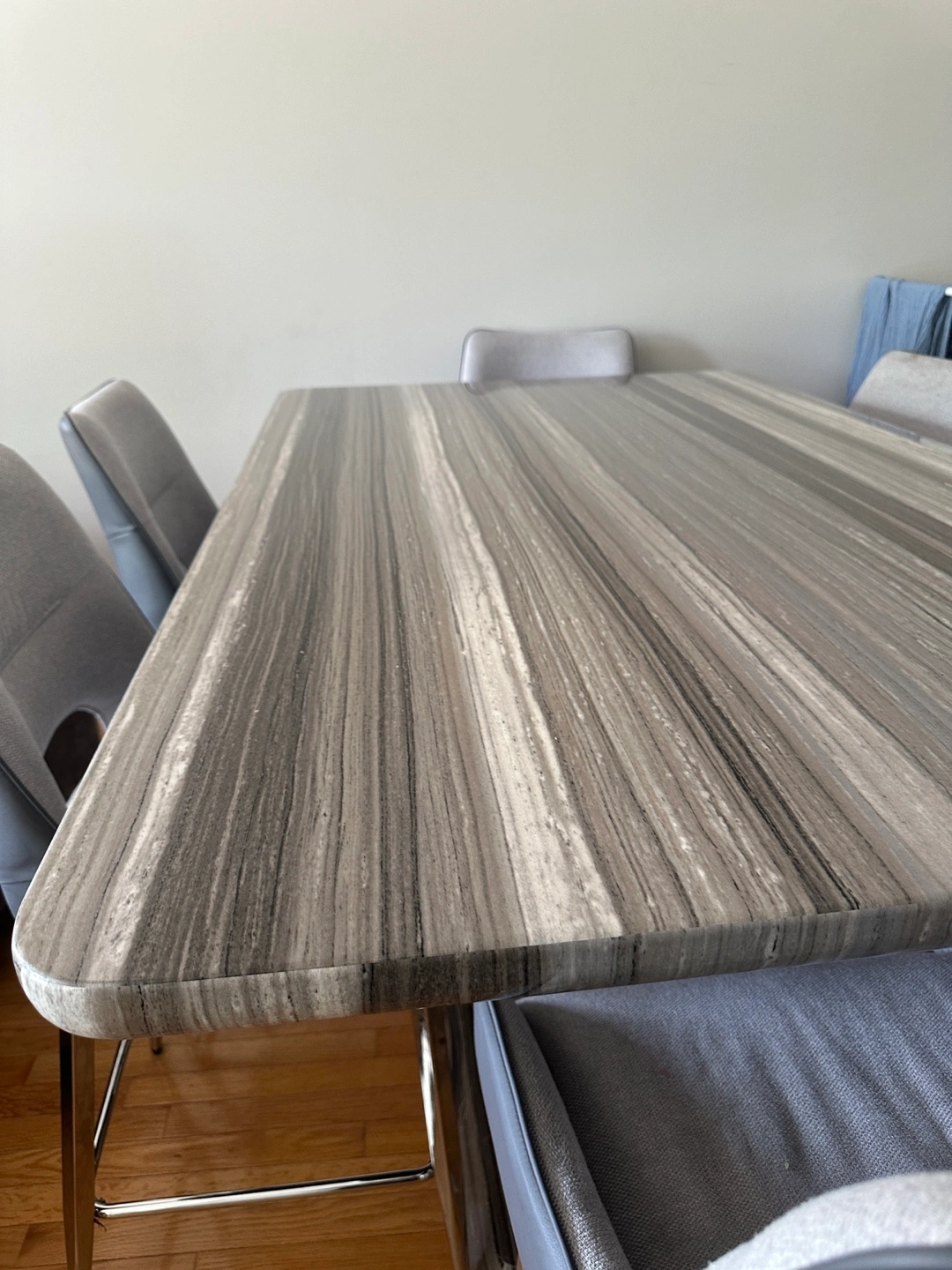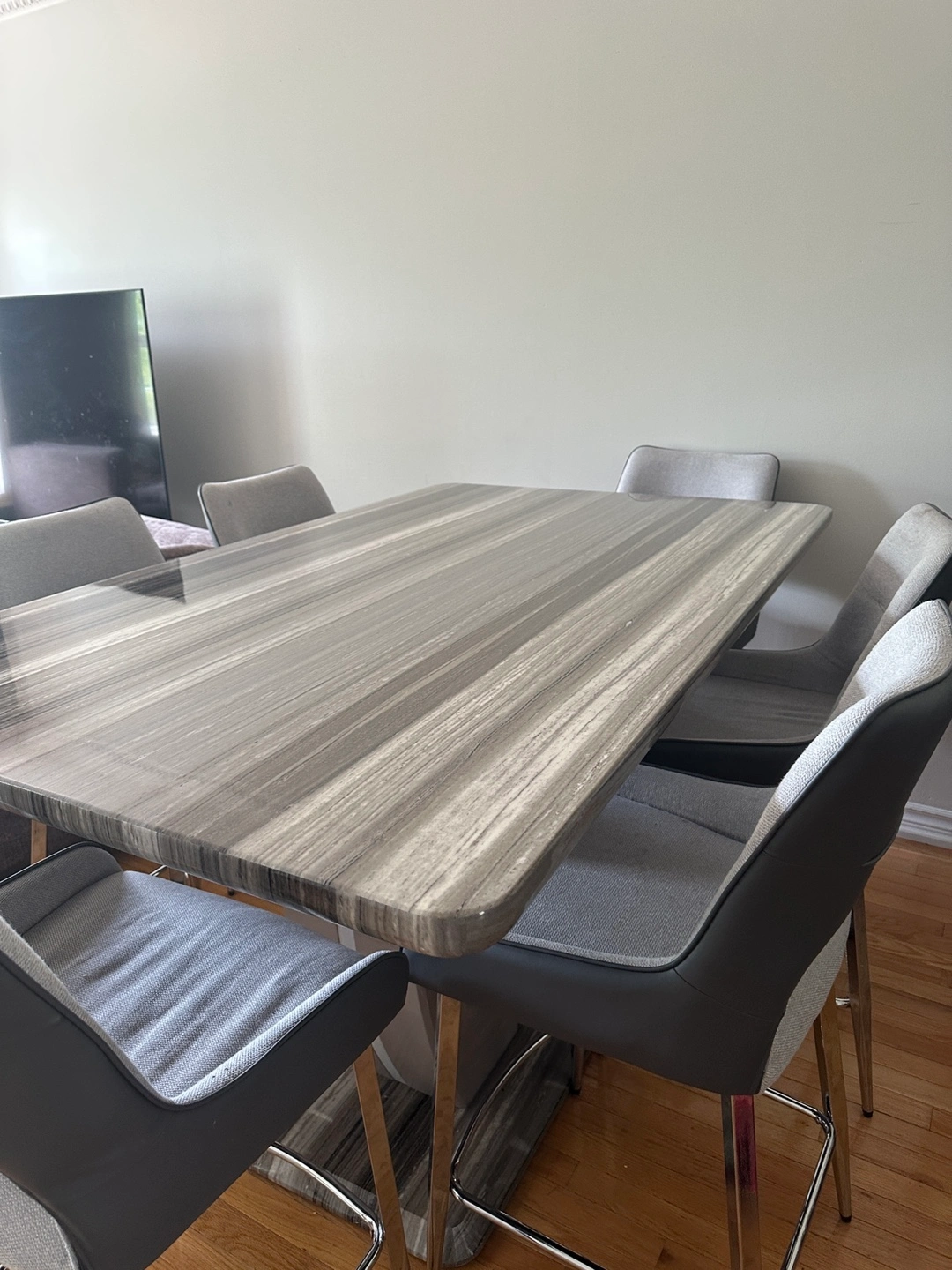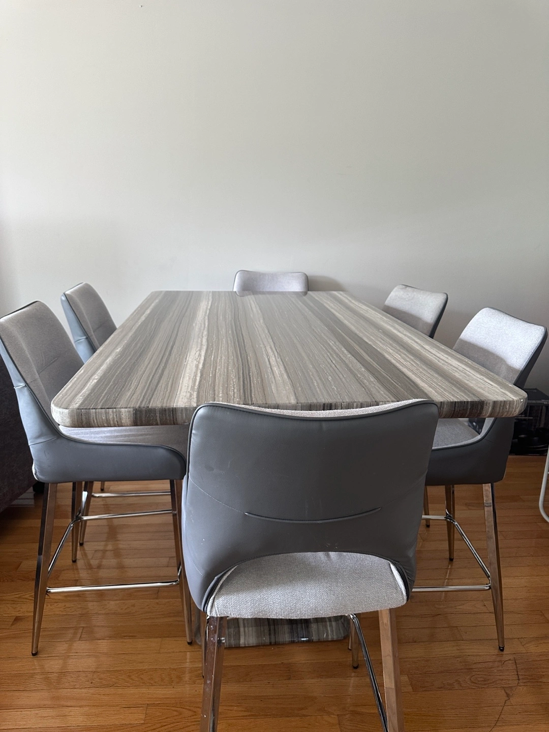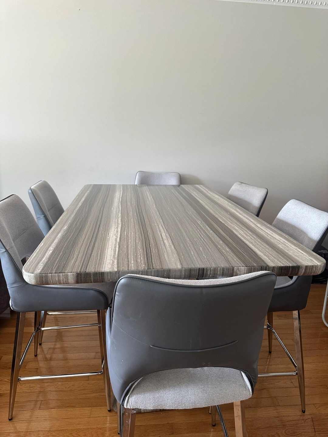 81Selling a dining table set that includes six chairs. The table has a grey, striped pattern and is in good condition. The chairs are also grey and complement the table nicely. Perfect for a family or anyone who enjoys hosting dinners!