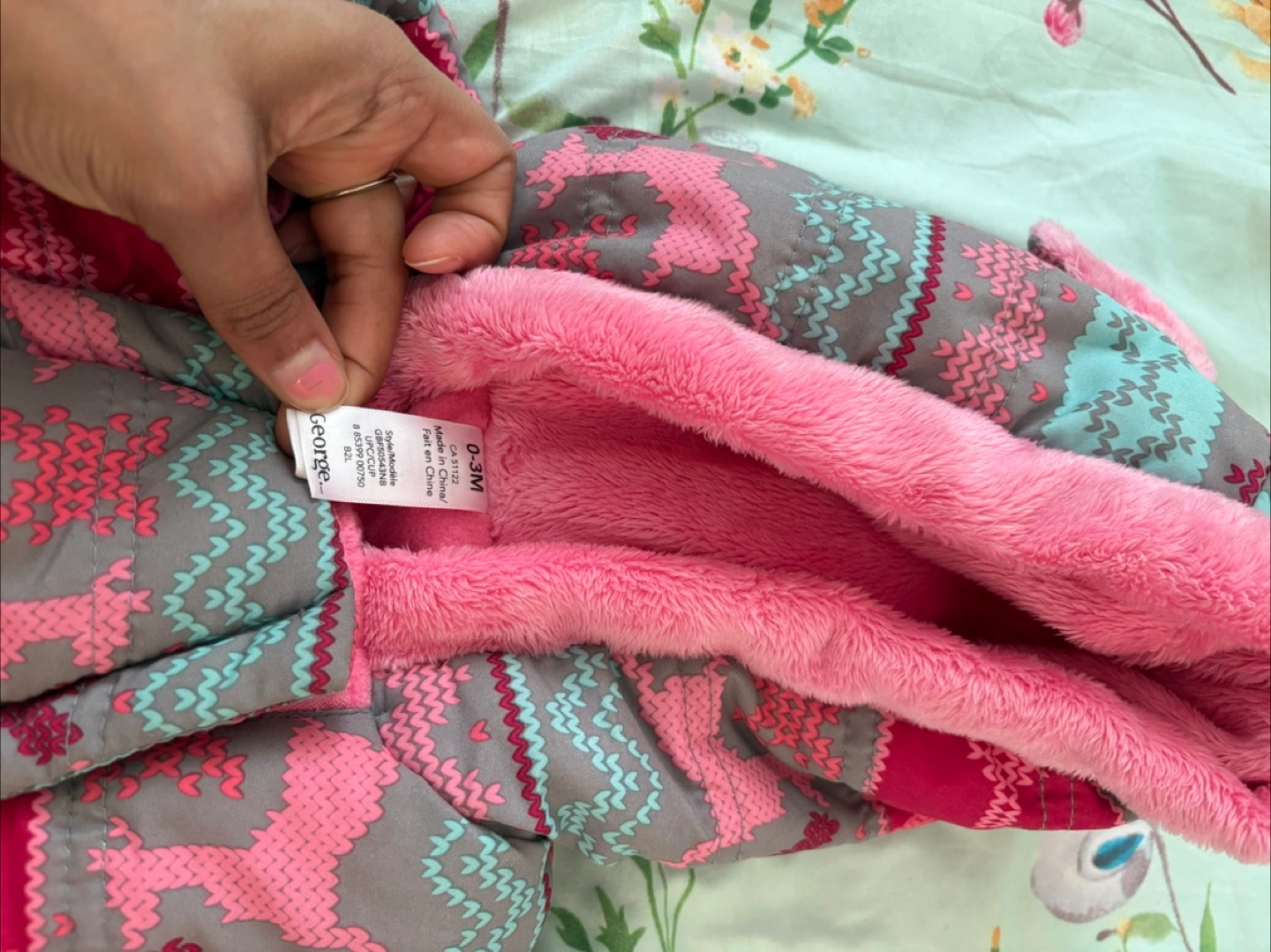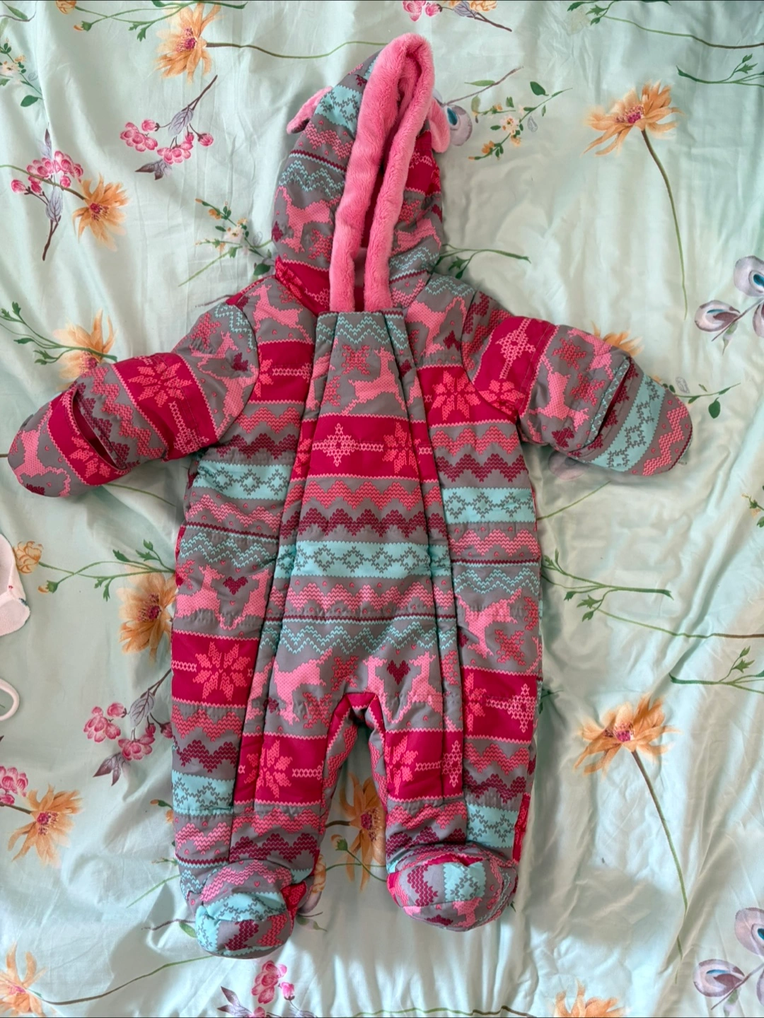 Cozy George baby snowsuit, perfect for keeping your little one warm this winter! The size is 0-3M. It features a cute pattern with pink and grey colours and a soft, plush lining