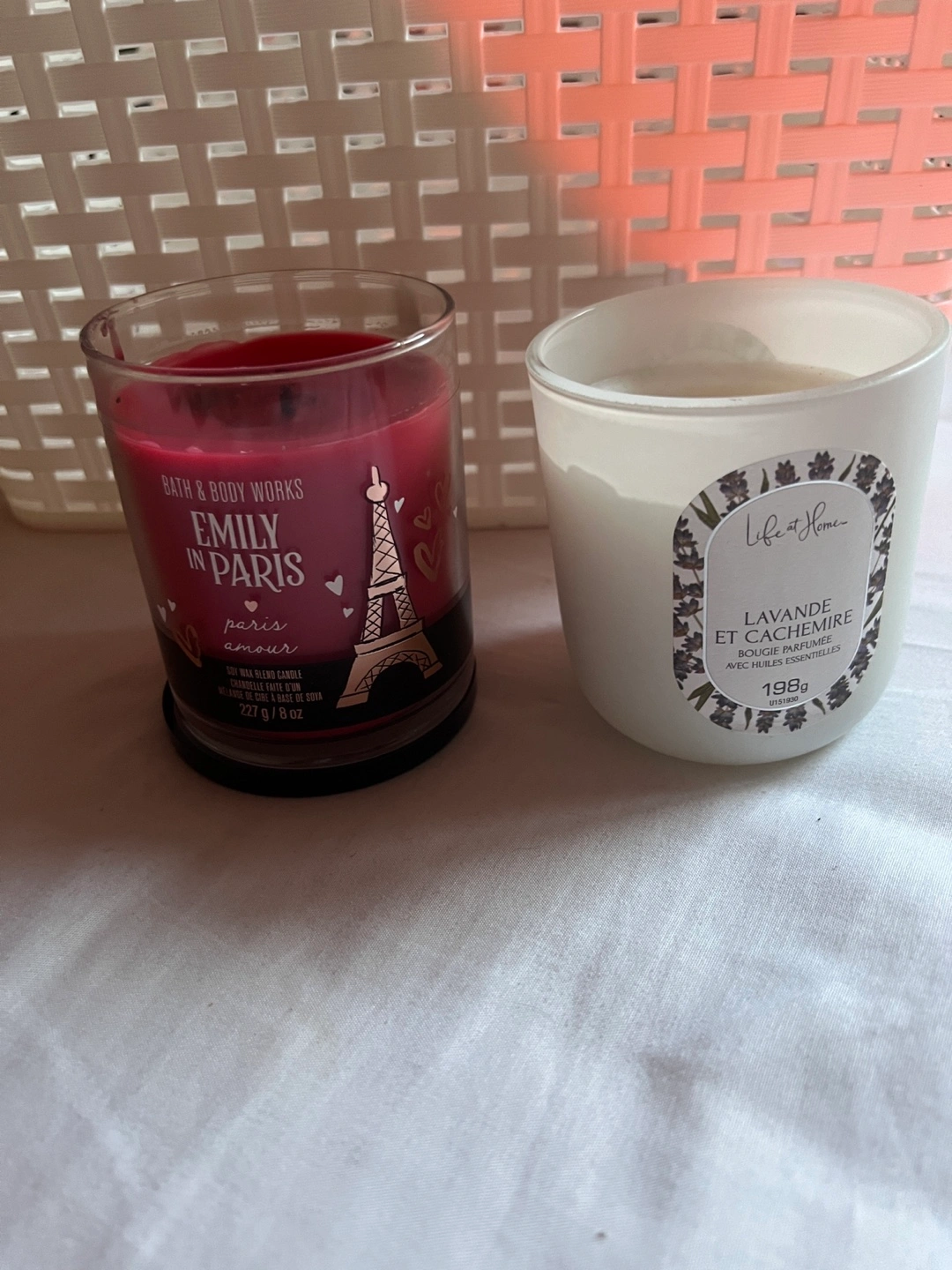 Selling two used candles: one Bath & Body Works 'Emily in Paris' and one Life at Home 'Lavande et Cachemire'. Both have been partially used, as pictured