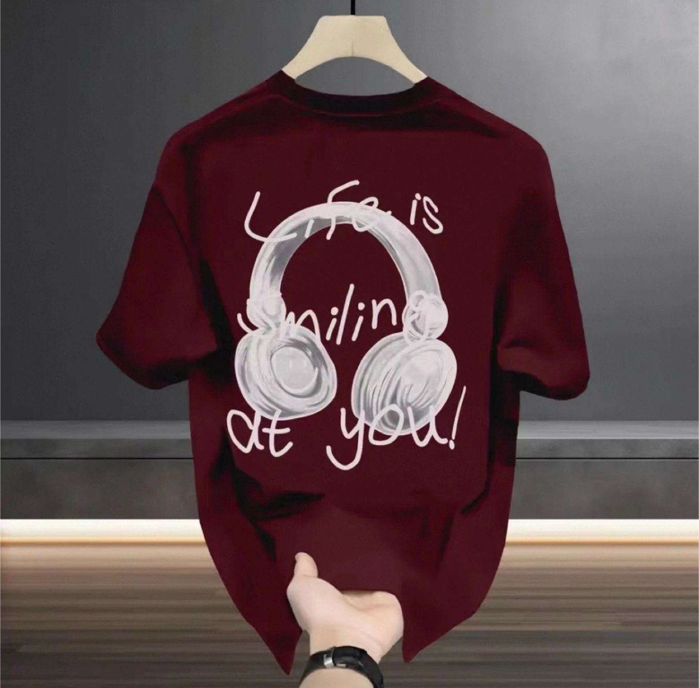 I'm selling a graphic print t-shirt. It comes in white, black, and maroon. The shirts have different graphic prints on them.