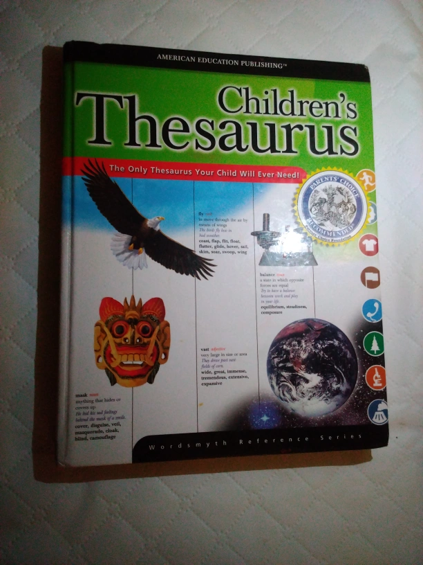 Children's Thesaurus by American Education Publishing. This reference book is designed for students from elementary school through later school years. It helps children choose the words they need to express themselves clearly and accurately. It is a comprehensive selection of word entries available.