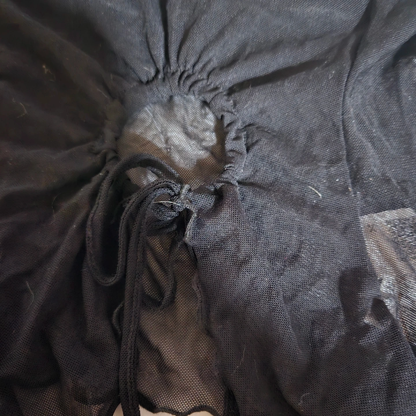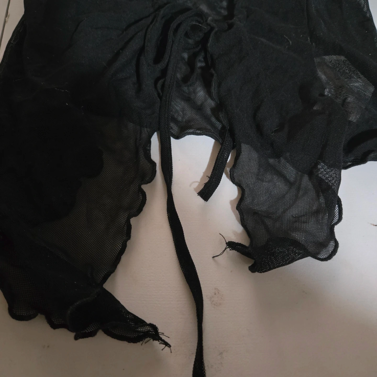 This is a black mesh skirt from SHEIN. It features a ruched front with a drawstring closure and a lettuce hem. The material is sheer mesh.