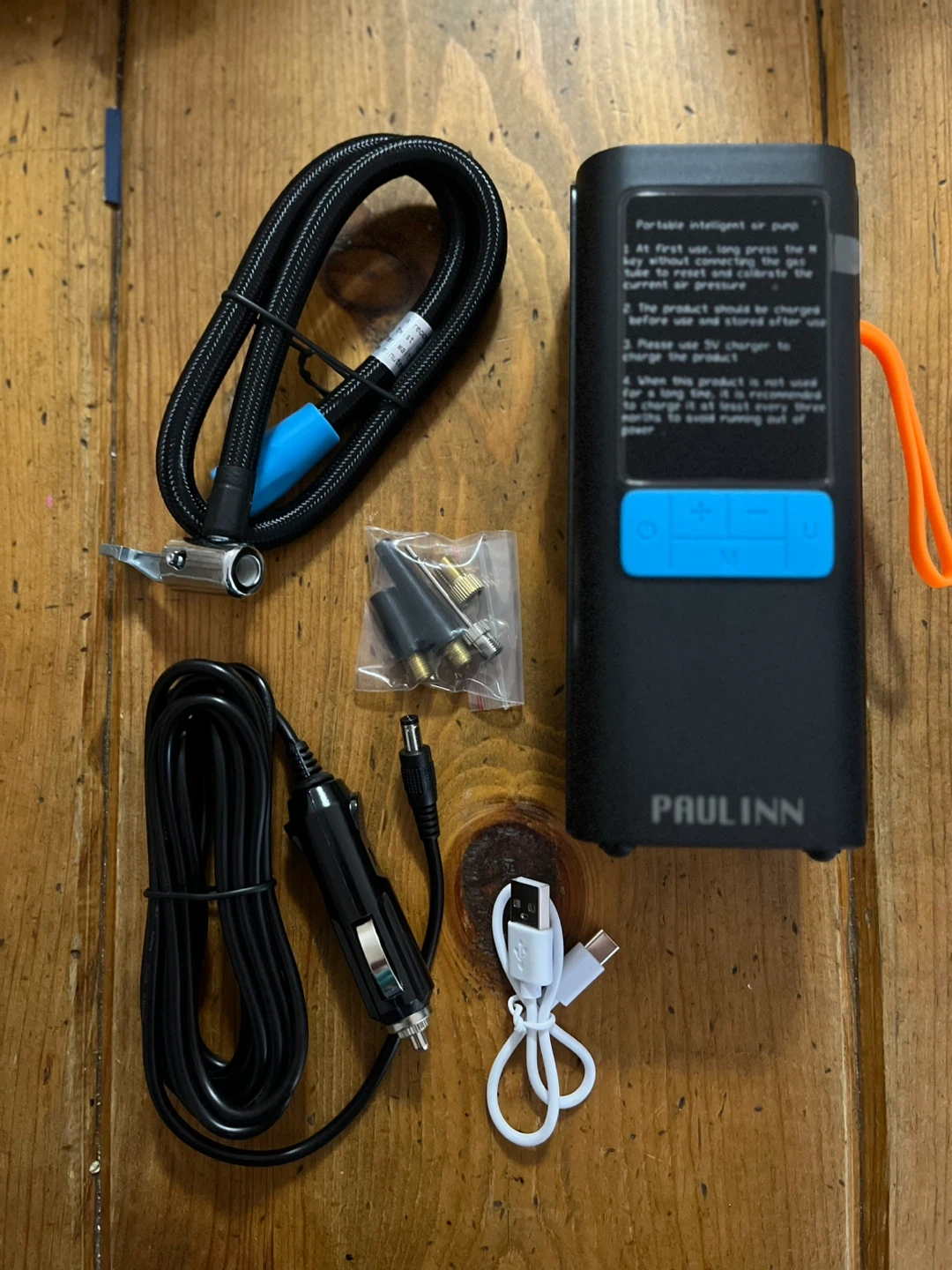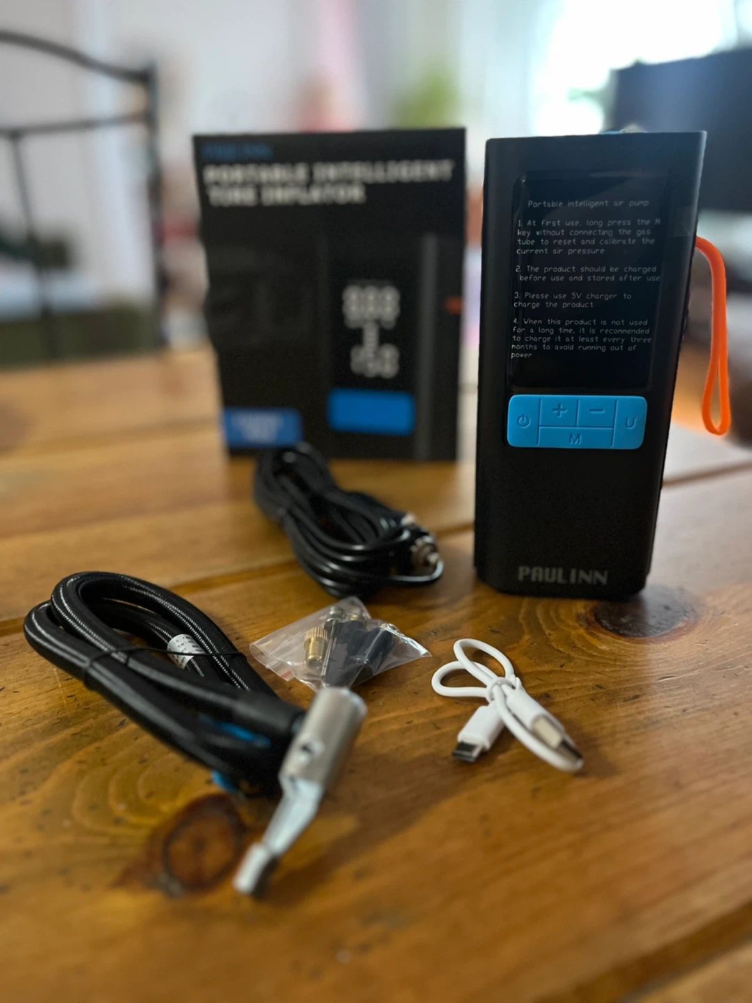 Comes with multiple accessories including inflation nozzles, adapters, charging cable, and a storage bag.