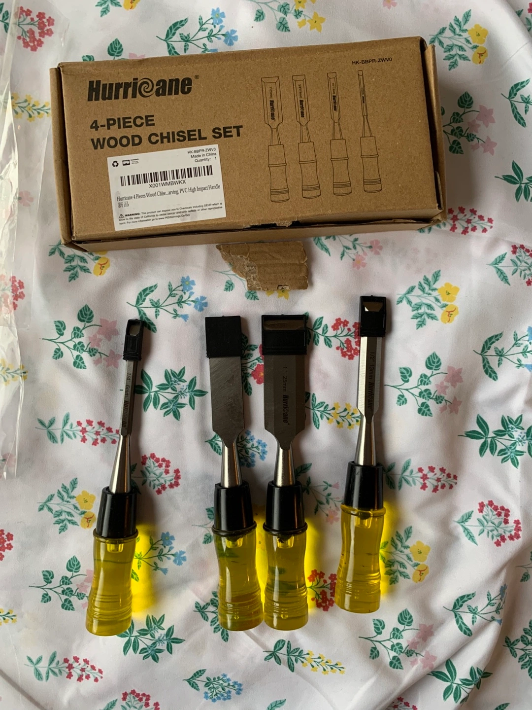 Selling a Hurricane 4-piece wood chisel set! It comes in its original box, ready for your next woodworking project. These chisels have clear acrylic handles for a comfortable grip and are made of high-impact handle material for durability. Great for both beginners and experienced woodworkers!