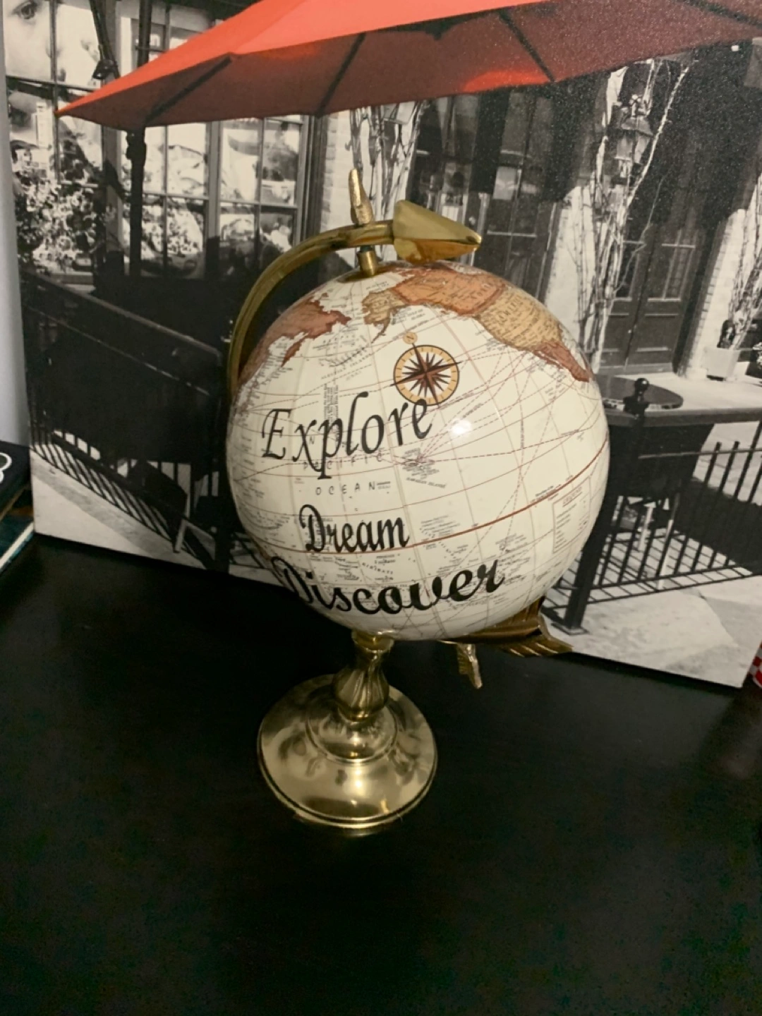 144Selling a decorative globe with the words "Explore Dream Discover" printed on it. It has a vintage-style map design and a gold-painted. It would make a nice addition to any room!