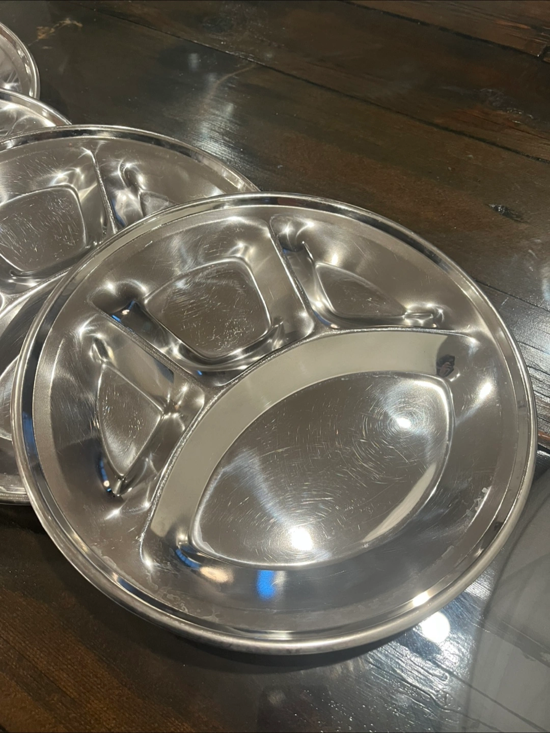 Selling a set of five stainless steel divided plates! They're perfect for portion control or keeping different foods separate. Great for kids or adults alike. They're in good condition and ready for a new home