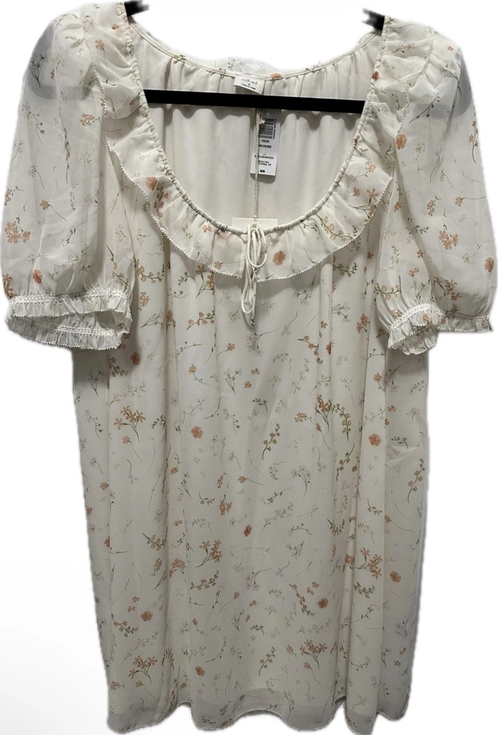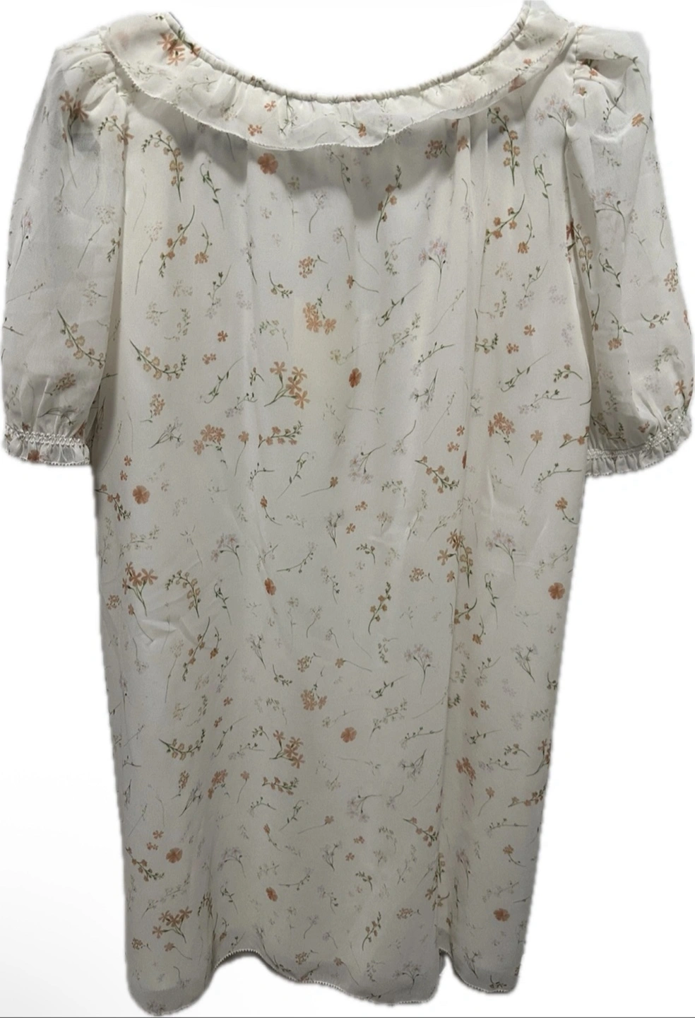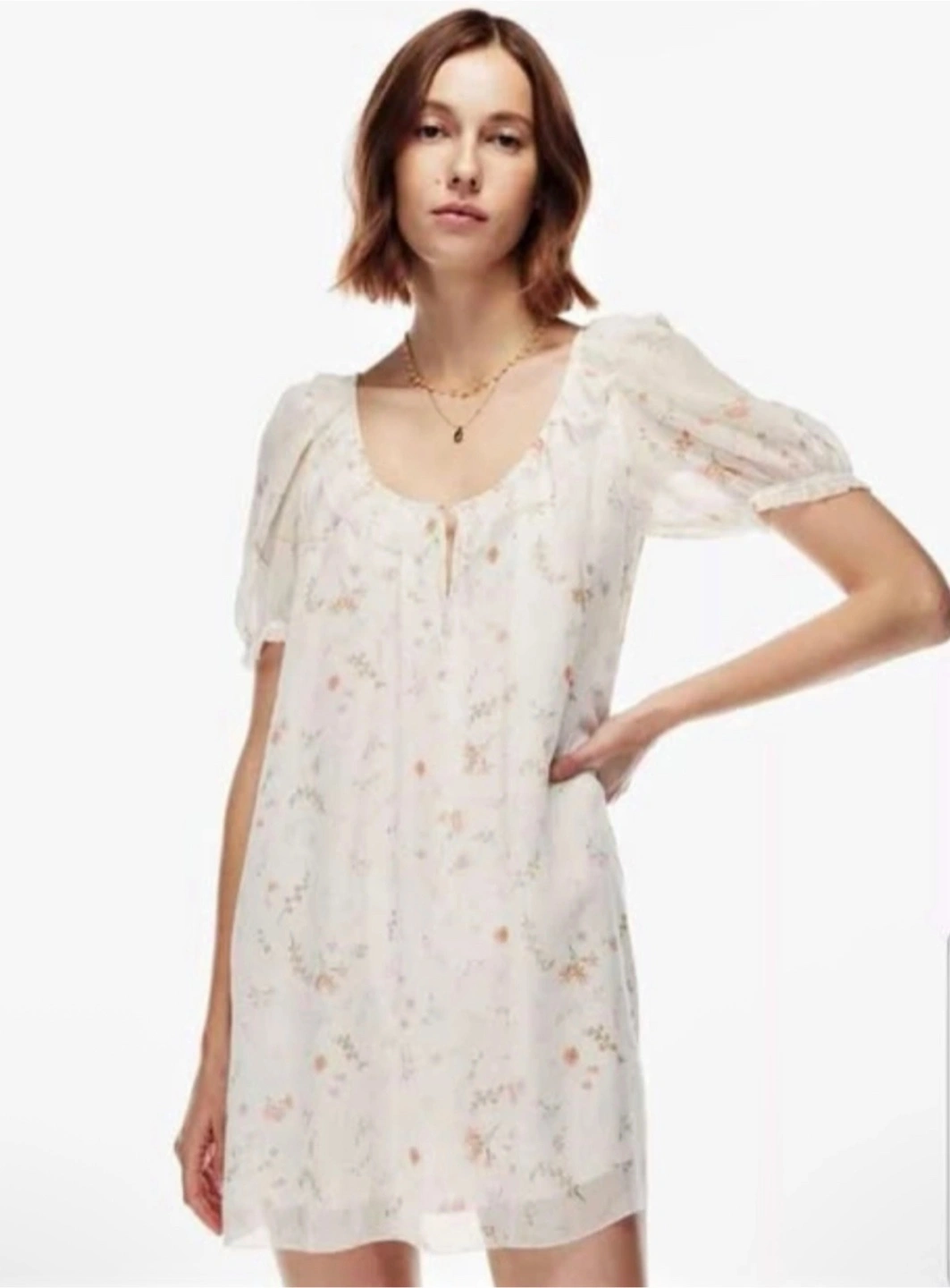 This is a lined mini dress with puff sleeves and a ruffled scoop neckline. It's crafted with lightweight, semi-sheer chiffon that's made from 100% recycled materials.