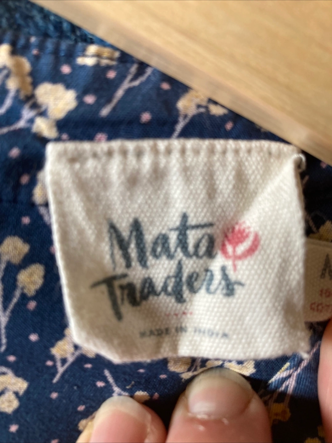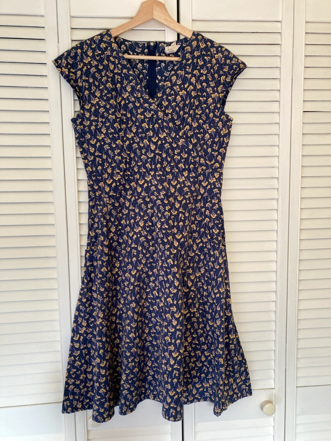 Size M, fits 4 a- 6. A super cute dress with a navy blue background and a lovely yellow floral print! It's in great condition and features a flattering v-neck with wrapped bodice, handy pockets, and a back zipper for a contoured fit. Perfect for spring or summer! 100% combed quality cotton fabric!