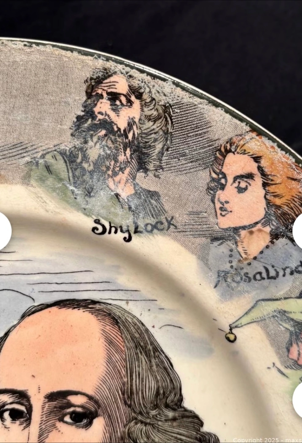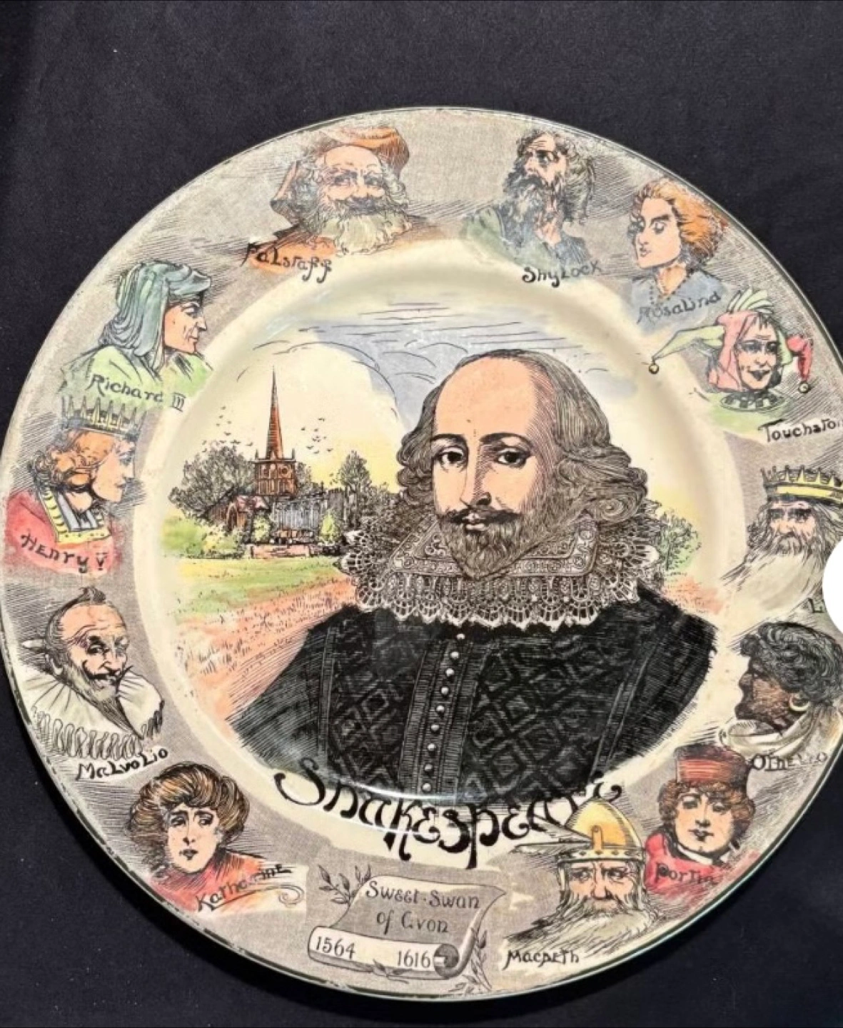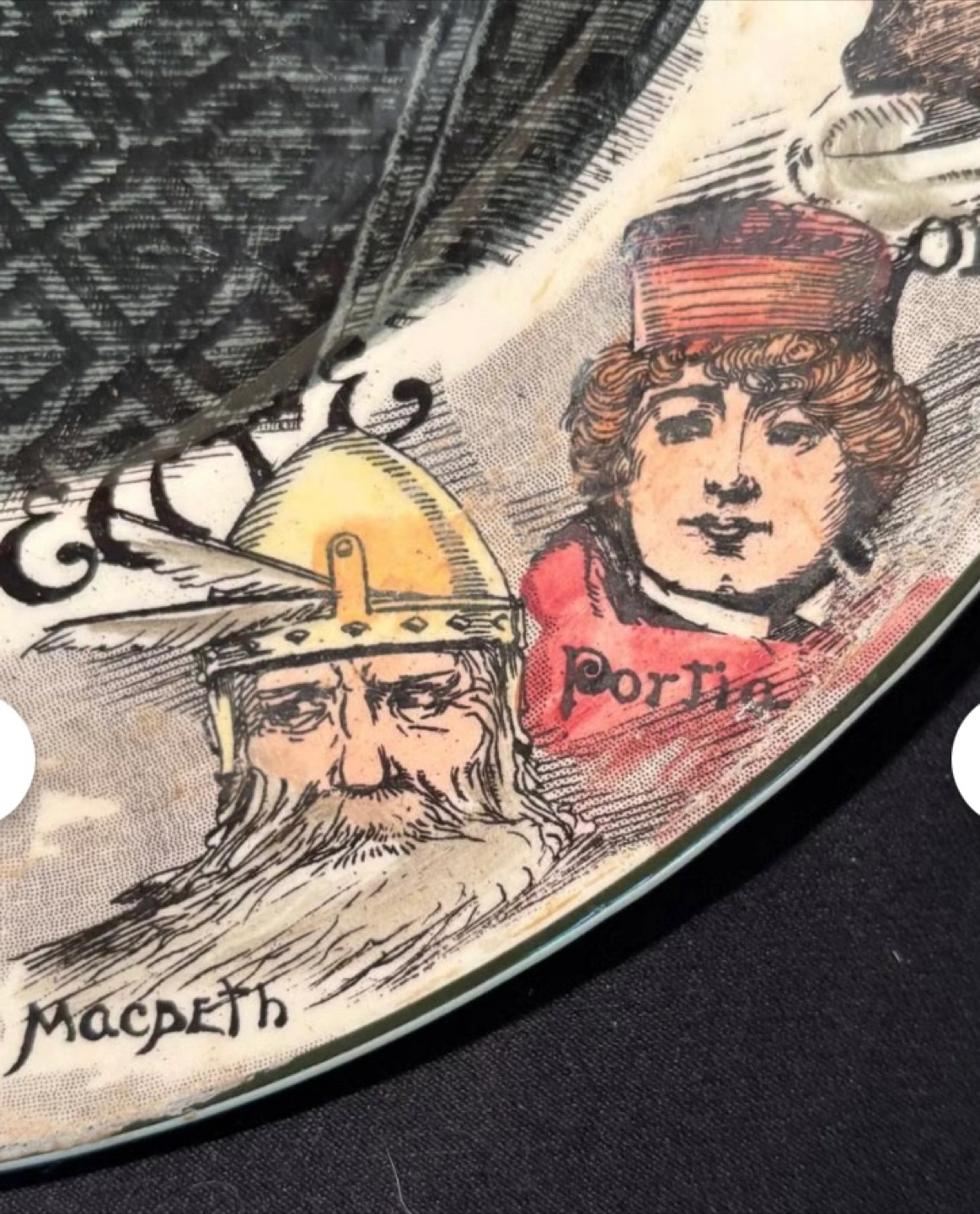 This decorative plate features illustrations of Shakespeare and various characters from his plays, including Falstaff, Shylock, Rosalind, and Richard III