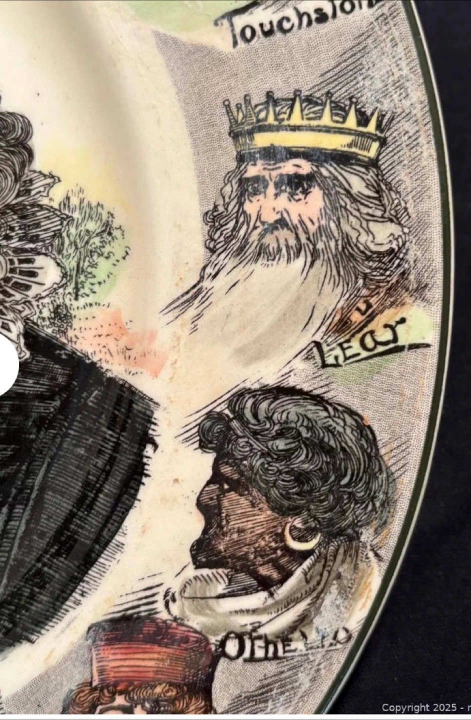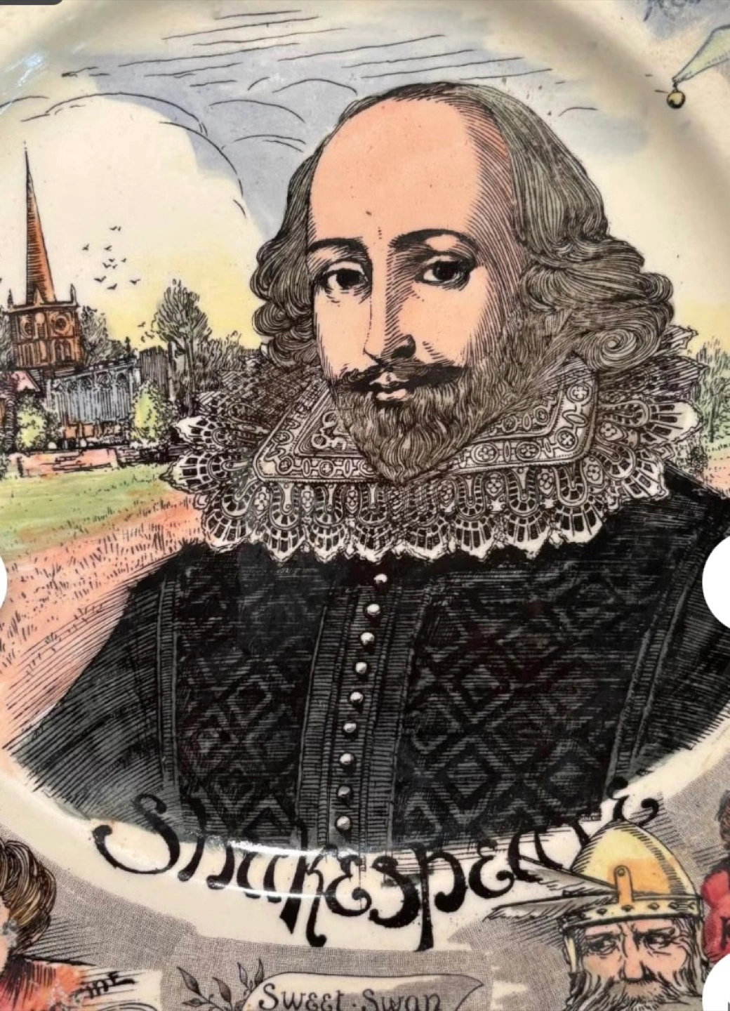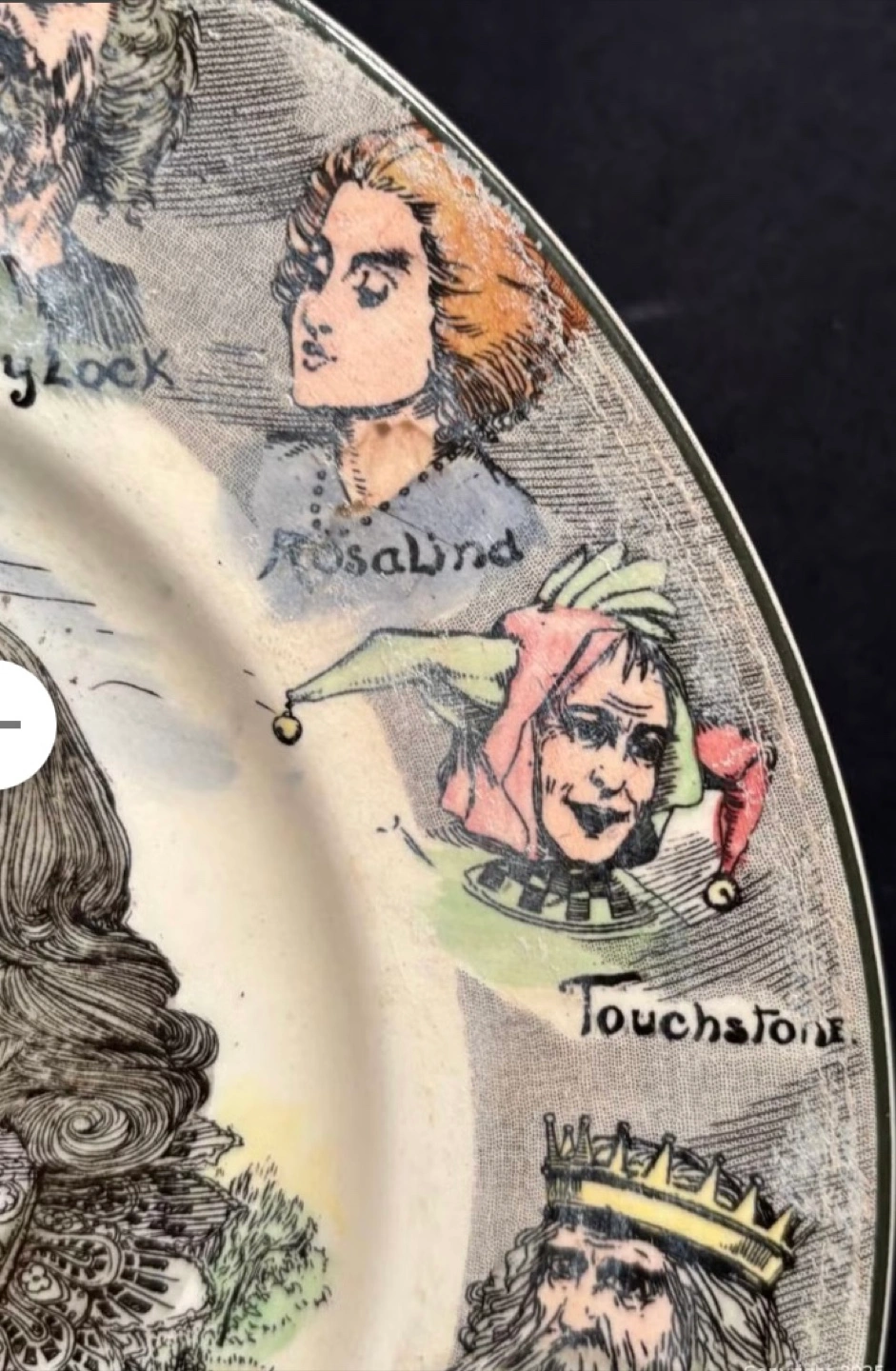 This decorative plate features illustrations of Shakespeare and various characters from his plays, including Falstaff, Shylock, Rosalind, and Richard III