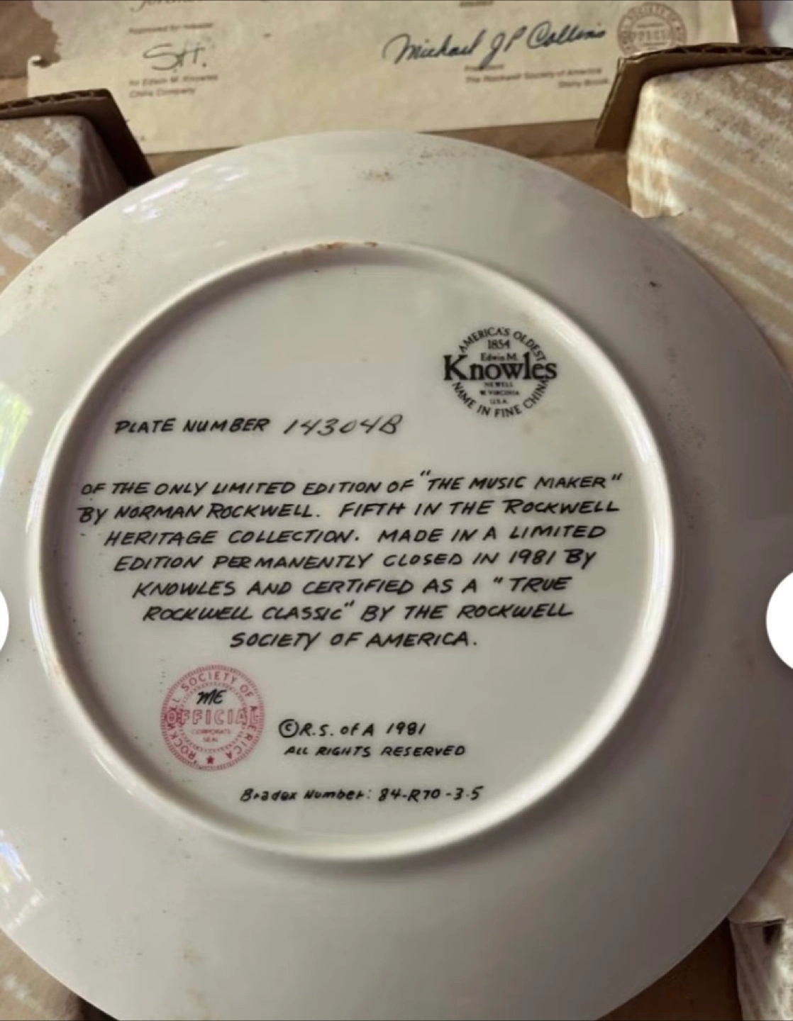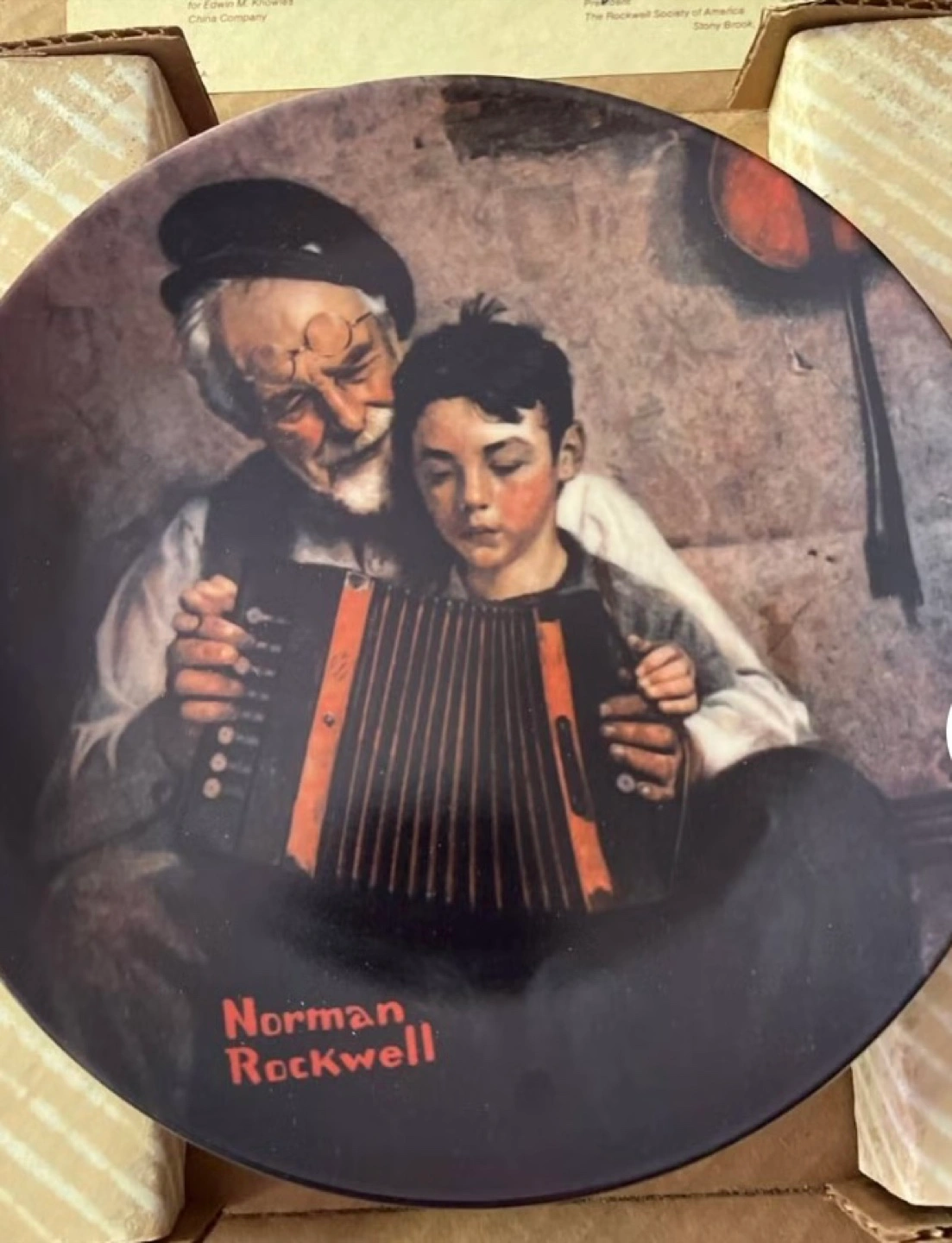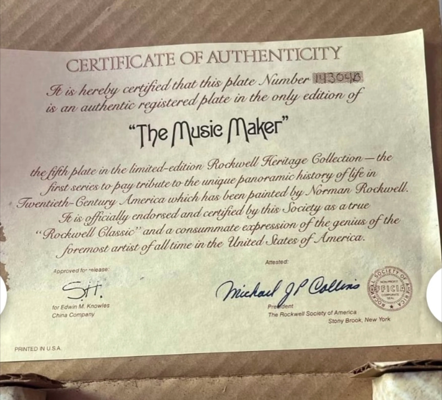 Selling a Norman Rockwell collector's plate titled "The Music Maker". It's part of the Rockwell Heritage Collection and comes with its original box and certificate of authenticity. Plate number 143048.