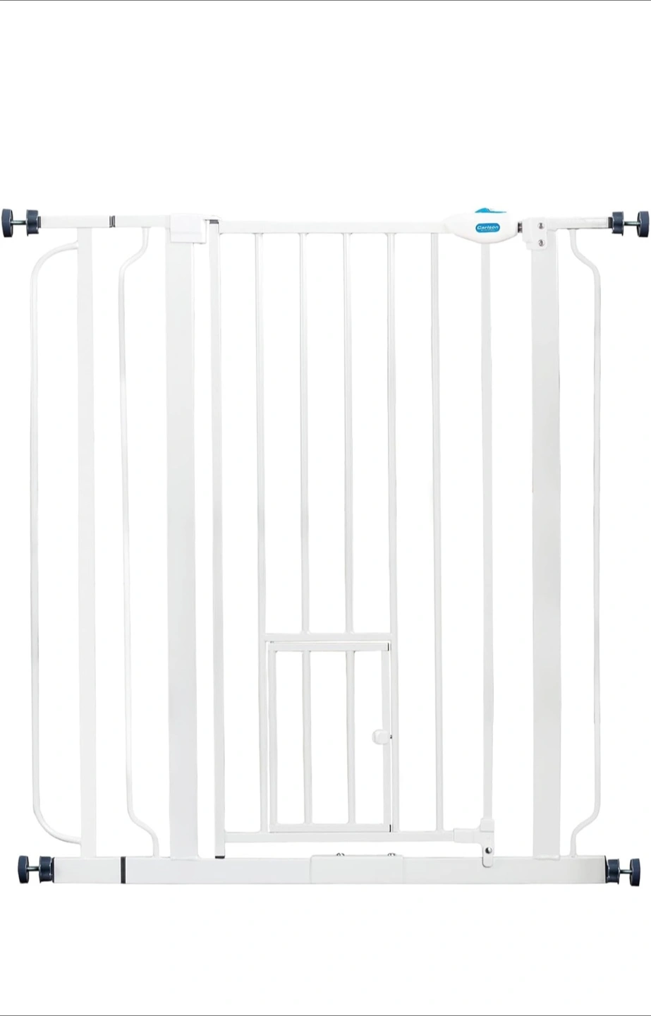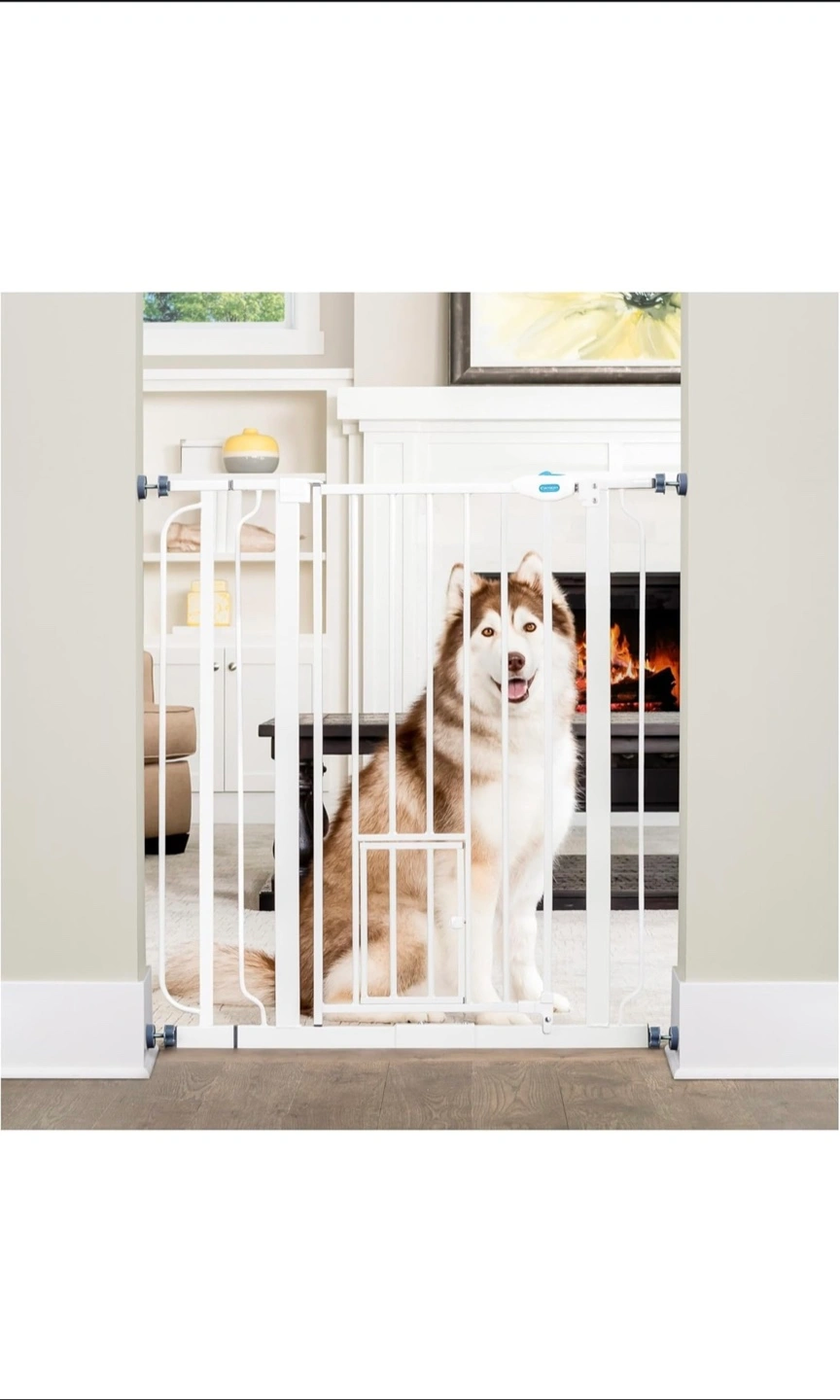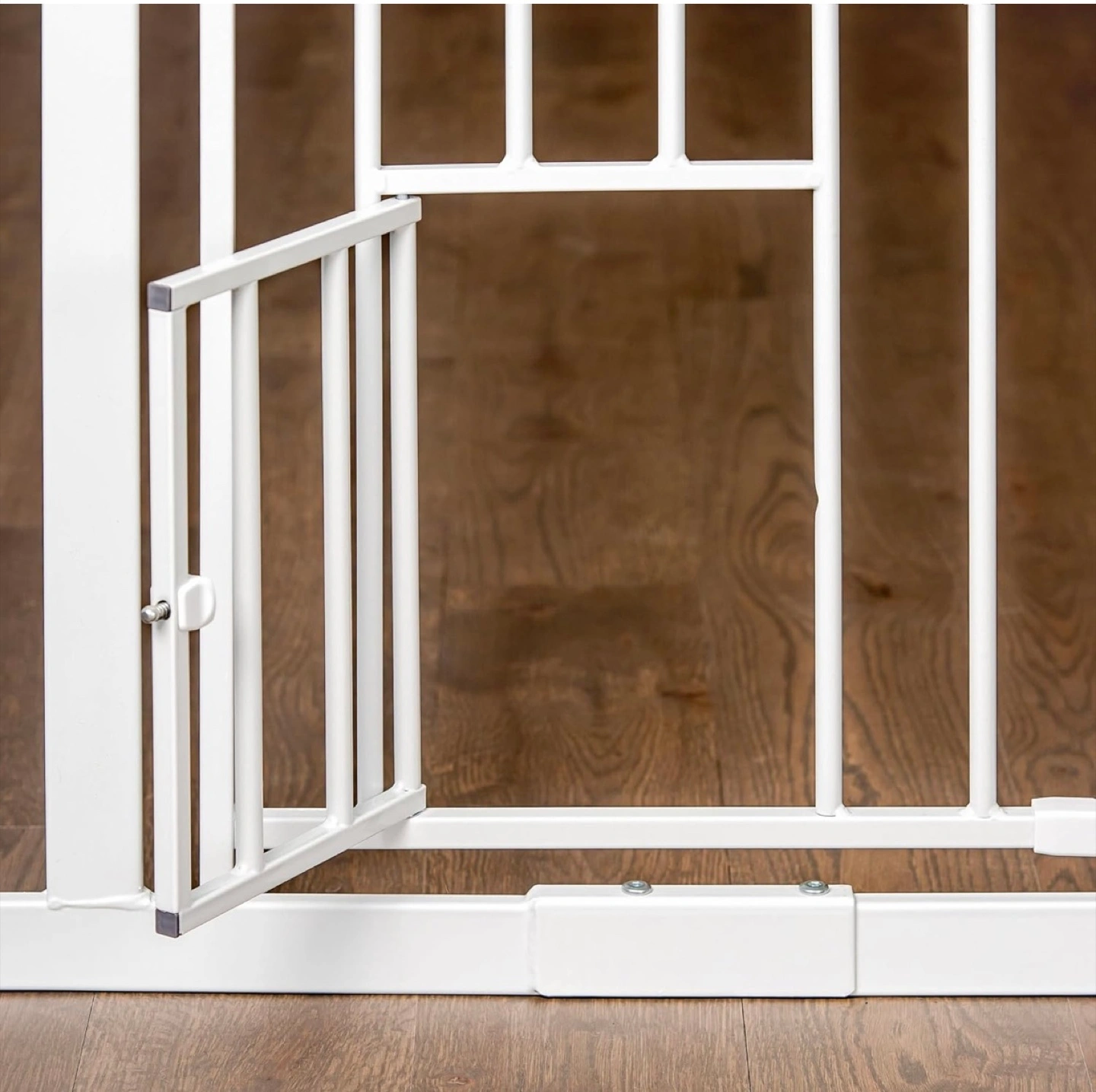 The Carlson 36” Extra Tall Walk-Thru Pet Gate with Small Pet Door in white is a durable, chew-proof solution to secure your home and contain pets. Made from 100% steel, it's ideal for larger or active dogs.