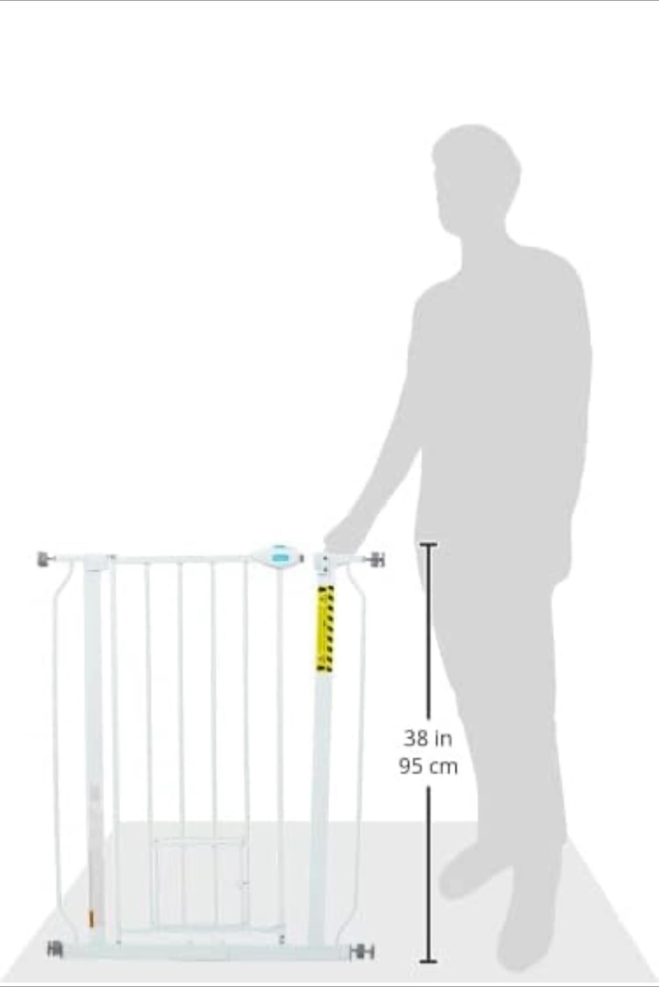 The gate includes a 4” extension for wider spaces. Whether blocking rooms or containing pets, this Extra Tall Pet Gate offers security and convenience, making it essential for any pet owner seeking a reliable home solution.