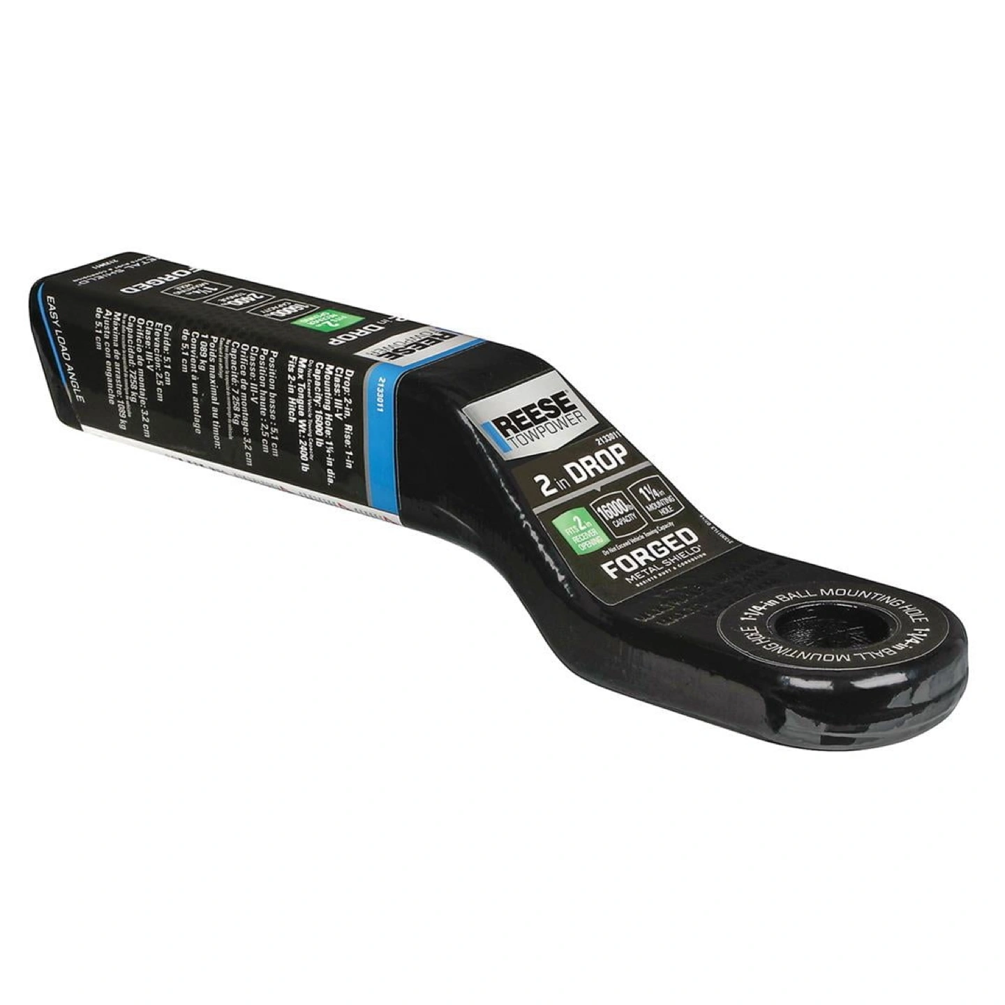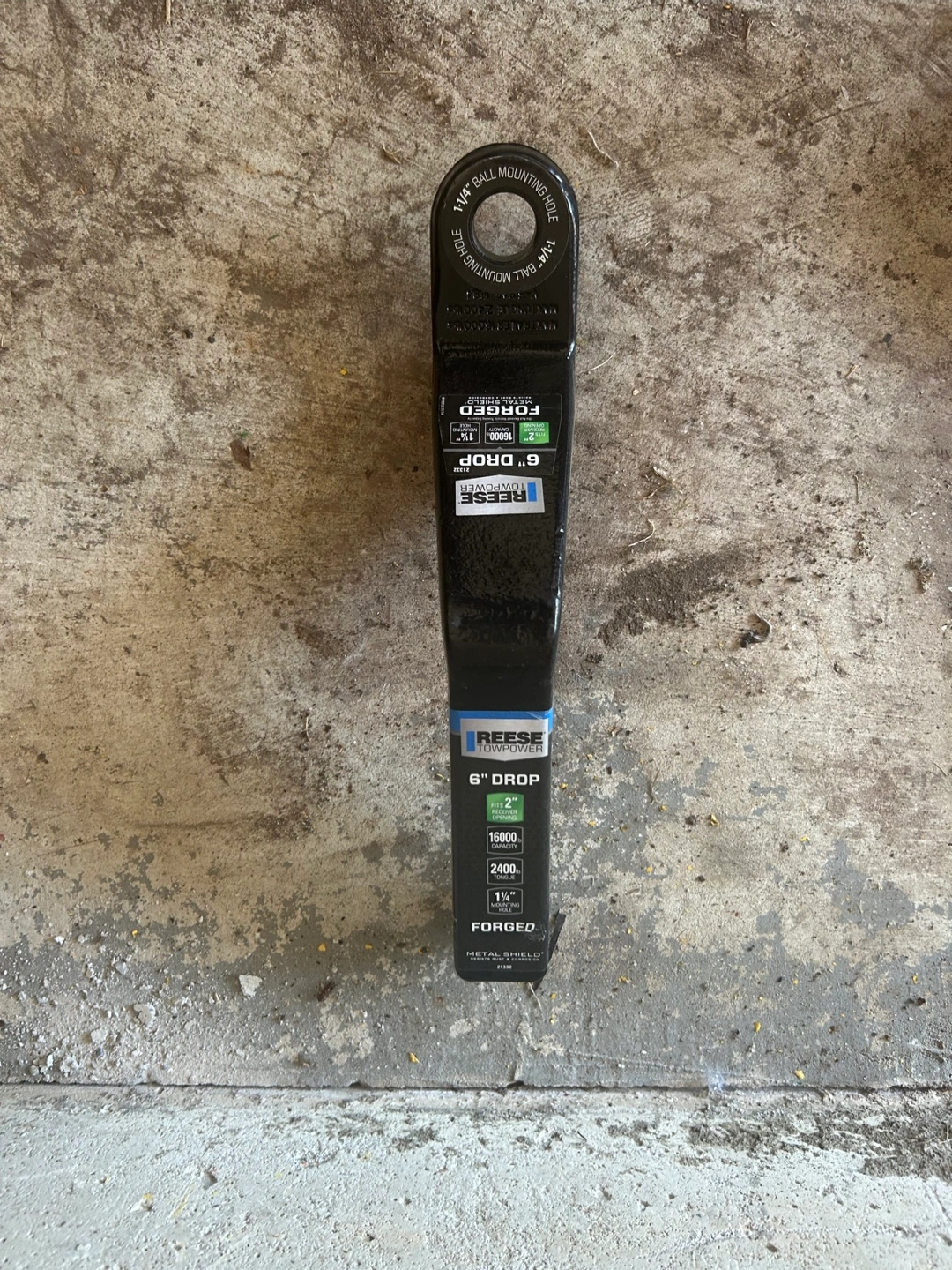 Selling a Reese Towpower hitch with a 2-inch drop. It's designed to fit a 2-inch receiver opening and has a capacity of 16000 lbs. It also has a 1 1/4 inch mounting hole. The hitch features a forged metal shield for corrosion resistance