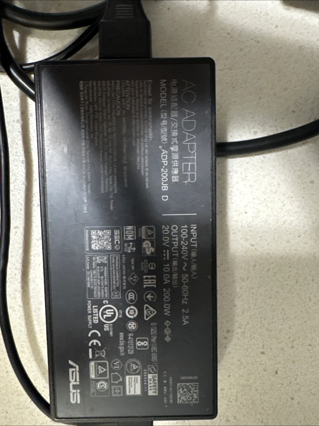 Free spare ASUS laptop charger, model ADP-200JB D. It's in great shape and ready to power your device! Input is 100-240V ~ 50-60Hz 2.5A, and output is 20.0V 10.0A 200.0W