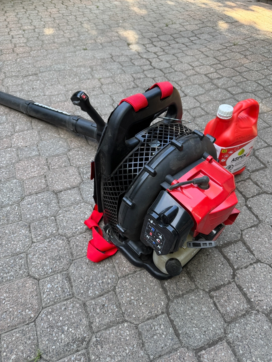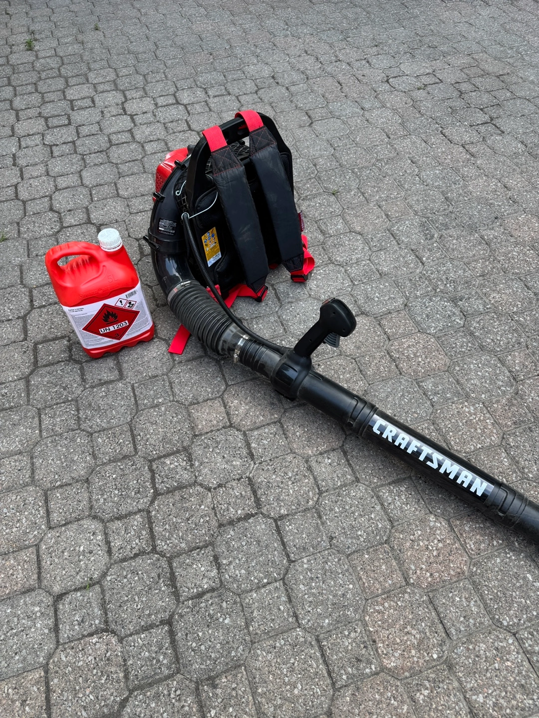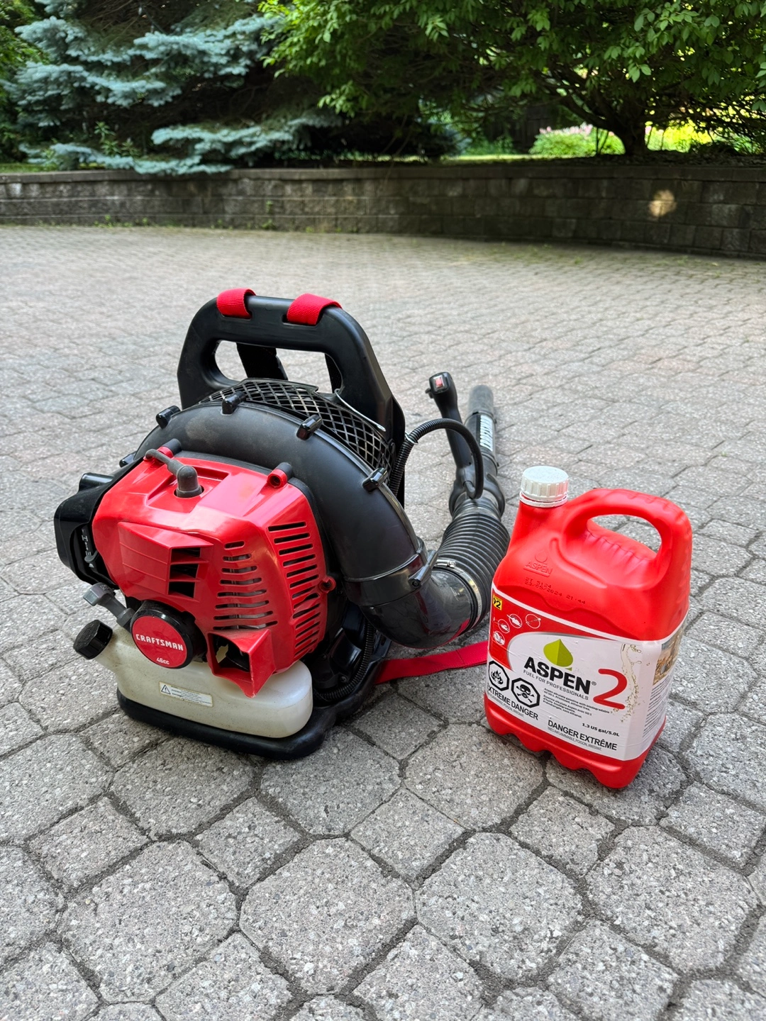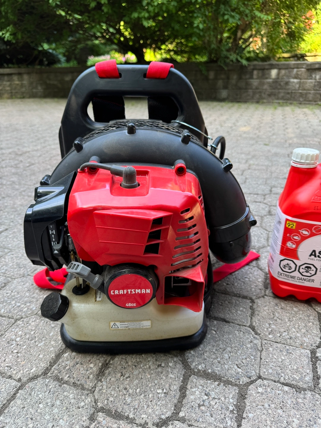 Craftsman gasoline backpack blower. It has a 46cc 2-cycle engine. Comes with 2 1/2 bottles (12 litres of gasoline worth over $100) of Aspen 2, alkylate gasoline, a pre-mixed fuel designed for two-stroke engines. We bought it a few months back for $359, and used it only a few times.