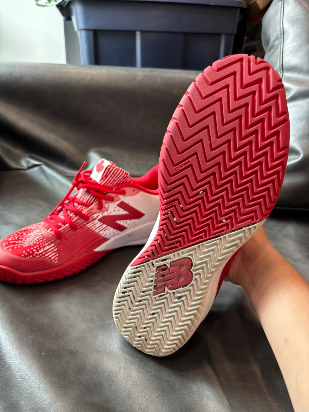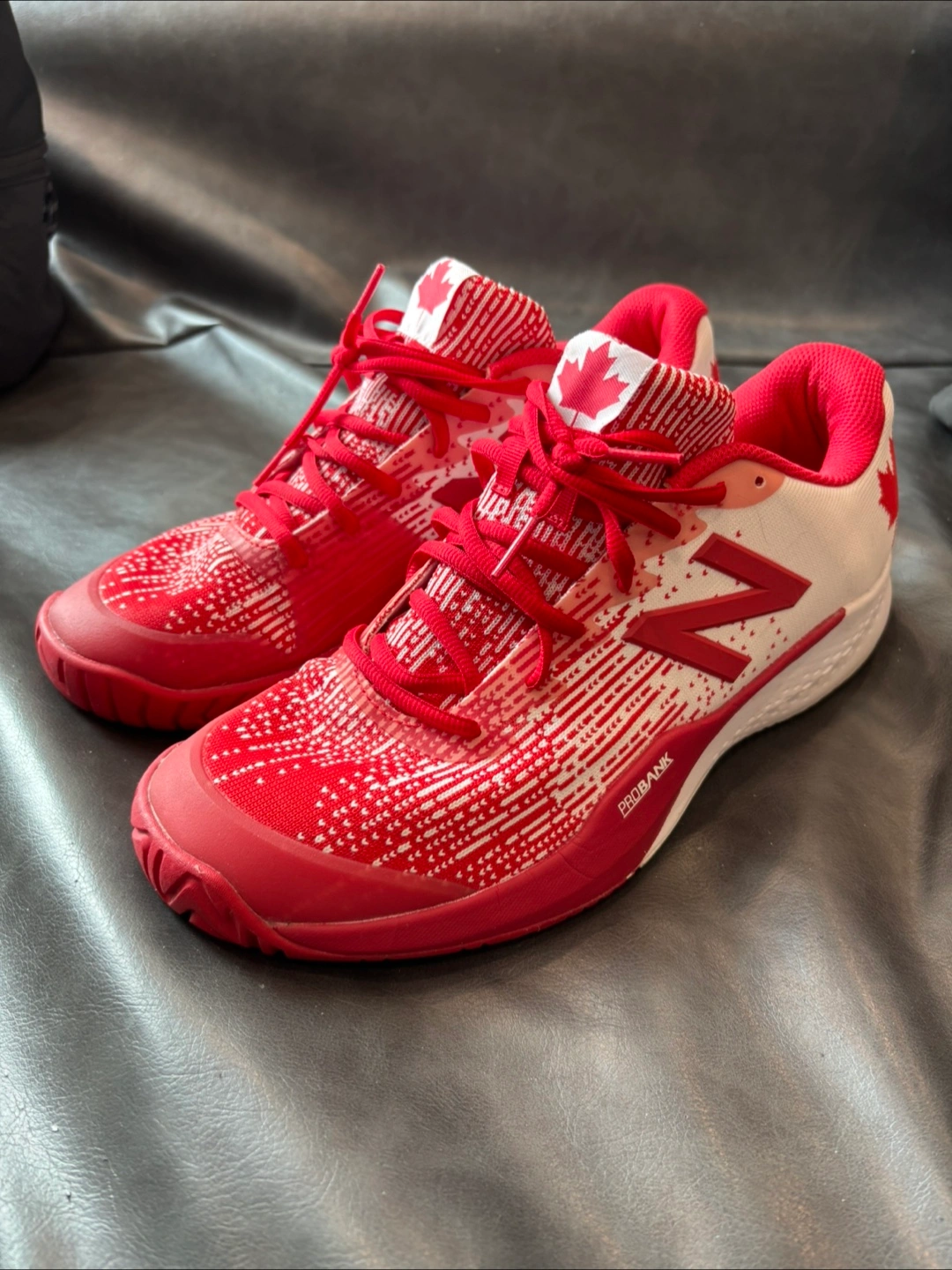 Selling a pair of New Balance FuelCell 996v5 tennis shoes in red and white! They feature a maple leaf design and are in great condition.
