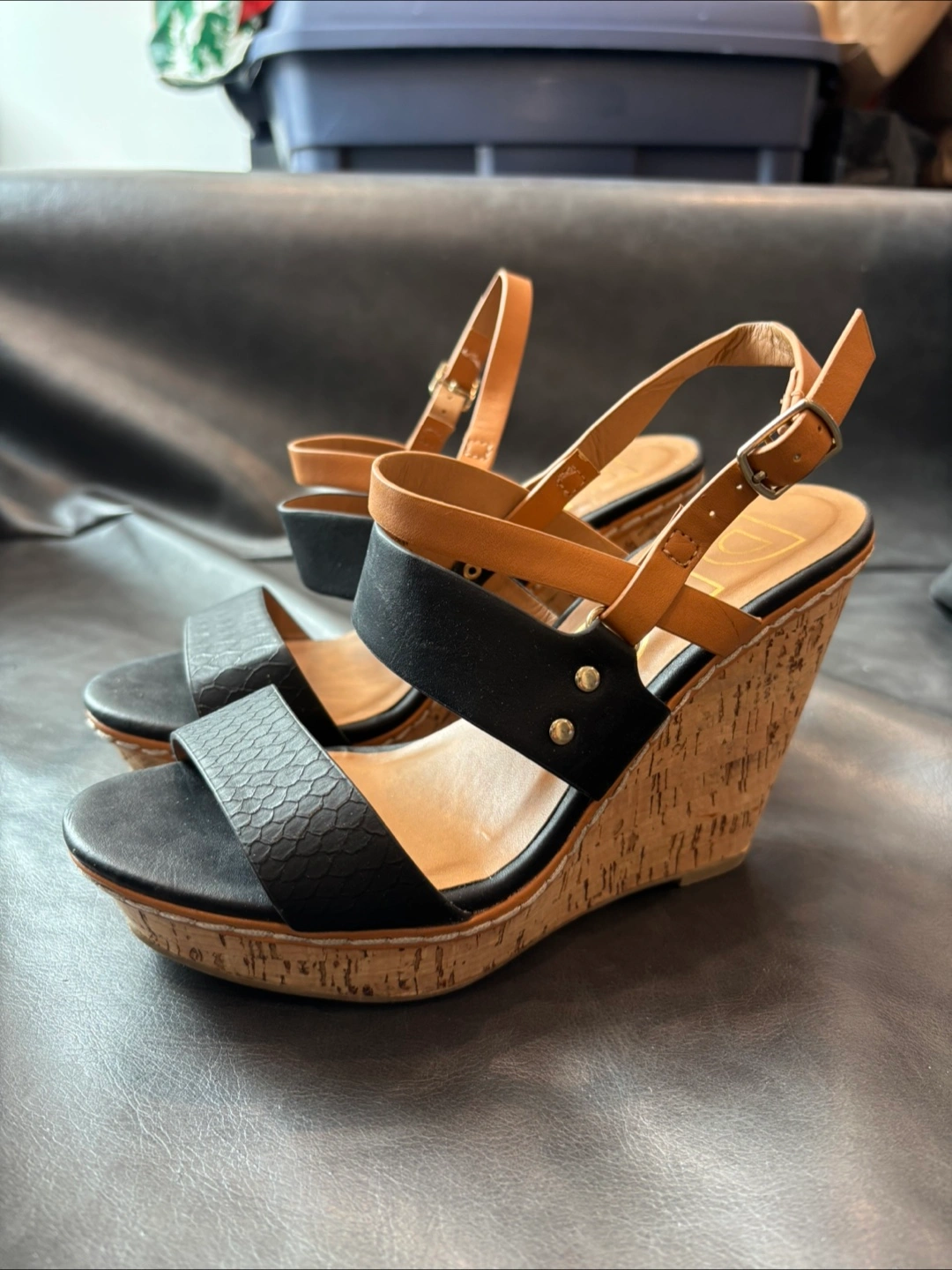 DLG wedge sandals in size 6. These cute sandals feature a black and tan colour combination with a cork wedge heel. They're in great shape and ready for a new home!