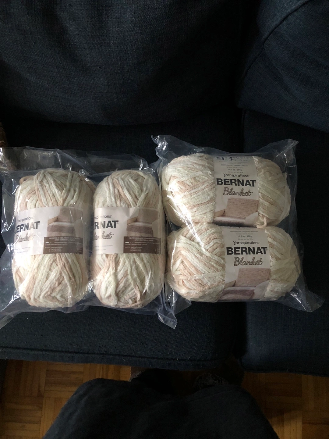 Selling four skeins of Bernat Blanket yarn in the Beach Blanket colour. Each skein is 10.5 oz / 300 g and contains 220 yards / 201 m of super bulky yarn. It's 100% polyester and machine washable and dryable, perfect for your next knitting or crochet project!