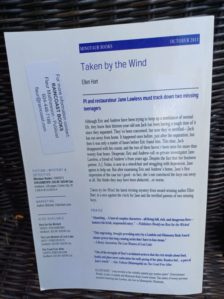Free book "Taken by the Wind" by Ellen Hart, part of the Jane Lawless Mystery series. This book is a mystery/detective fiction novel published by Minotaur Books in October 2013. It's a captivating read!