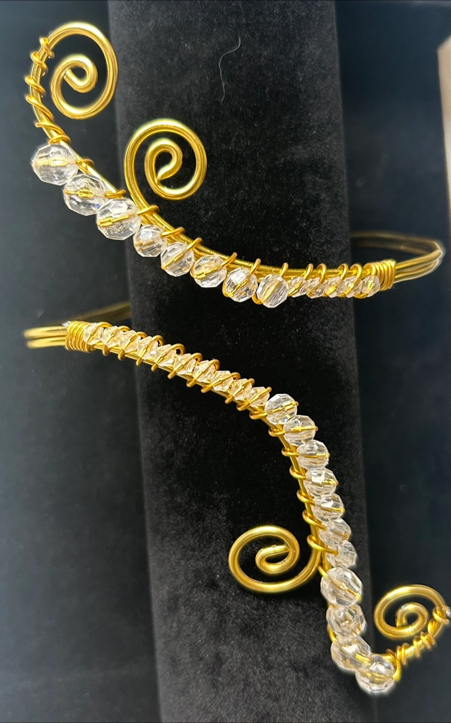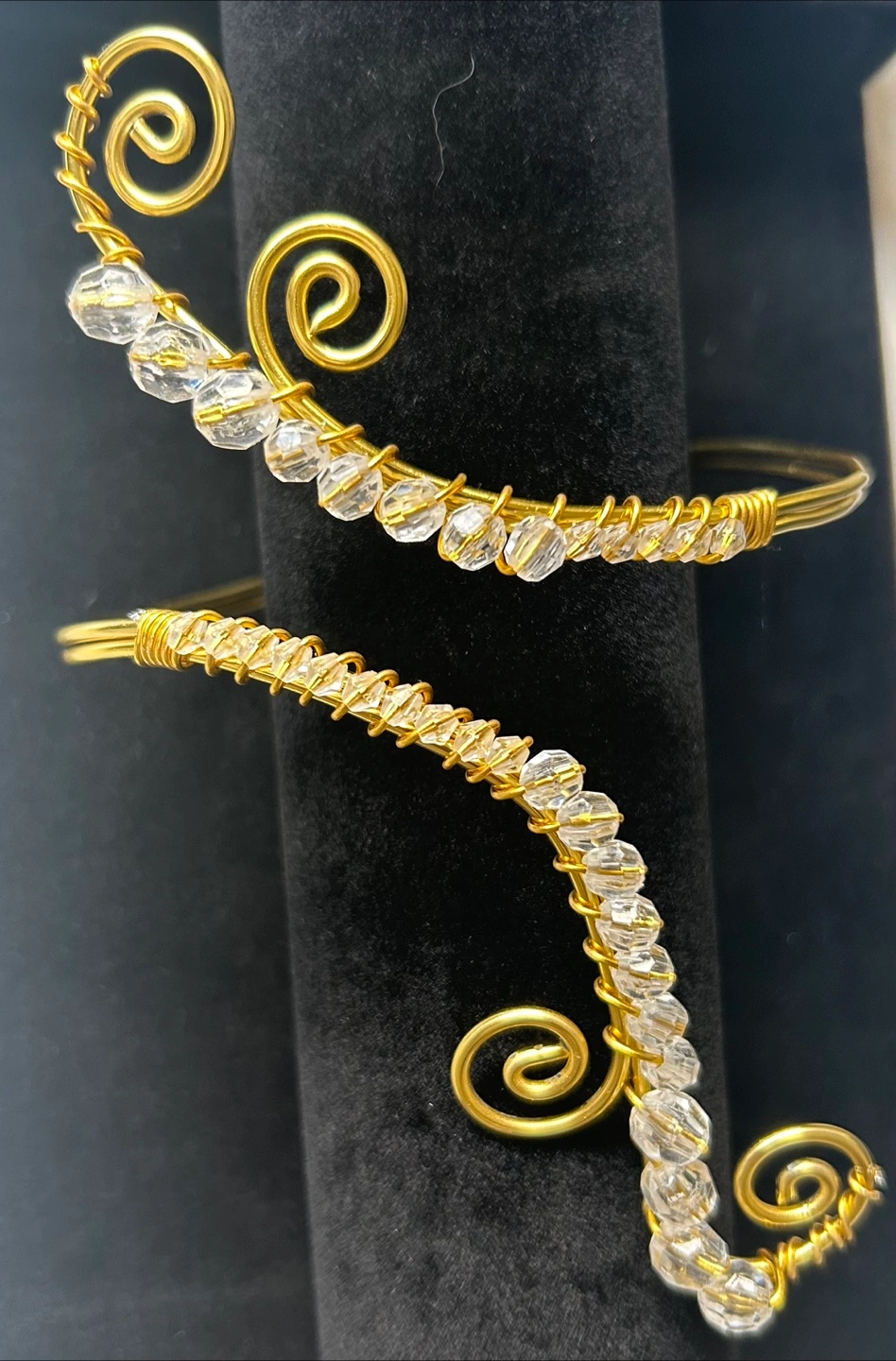 Selling a handmade gold tone upper arm cuff! It features a spiral design with clear beads. A unique statement piece to add to your jewelry collection