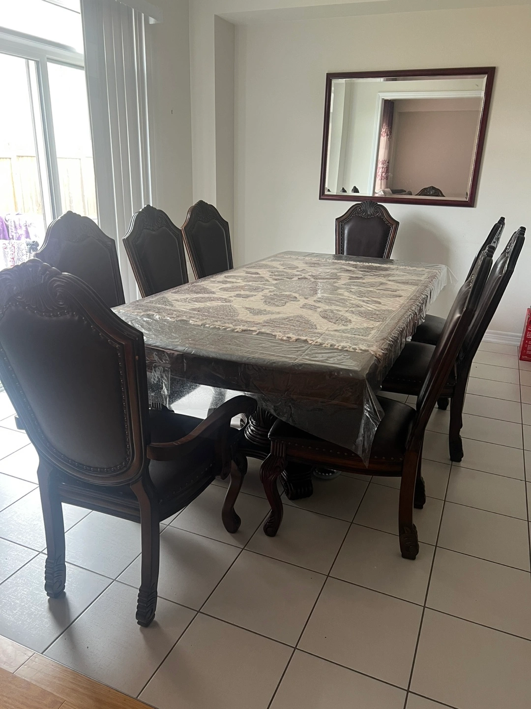 Selling a dining table with six chairs. The table has a decorative covering on top. The chairs are dark brown with ornate carvings. Great for a dining room or kitchen space