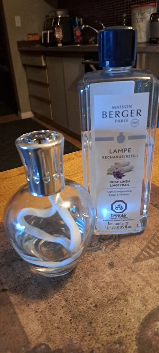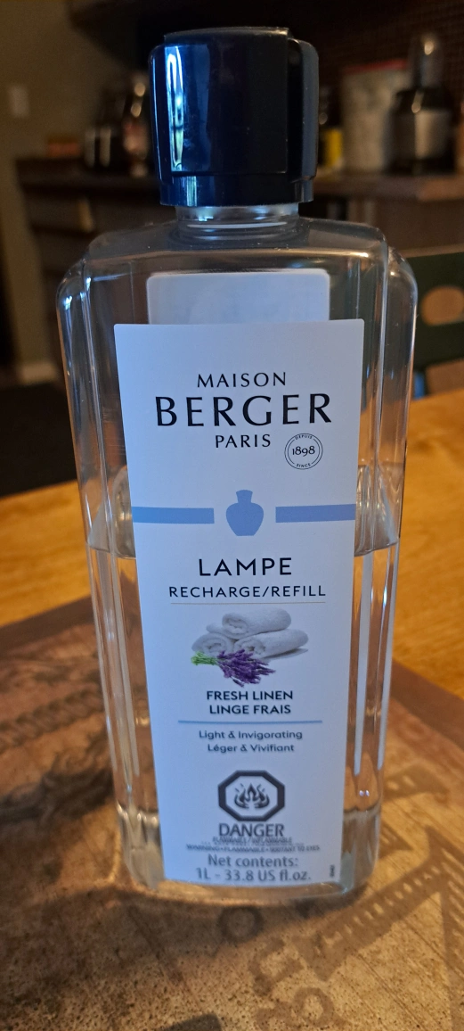 Selling a Maison Berger Paris Lampe with a just over half Fresh Linen refill. The refill is a light and invigorating scent. Net contents: 1L / 33.8 US fl oz