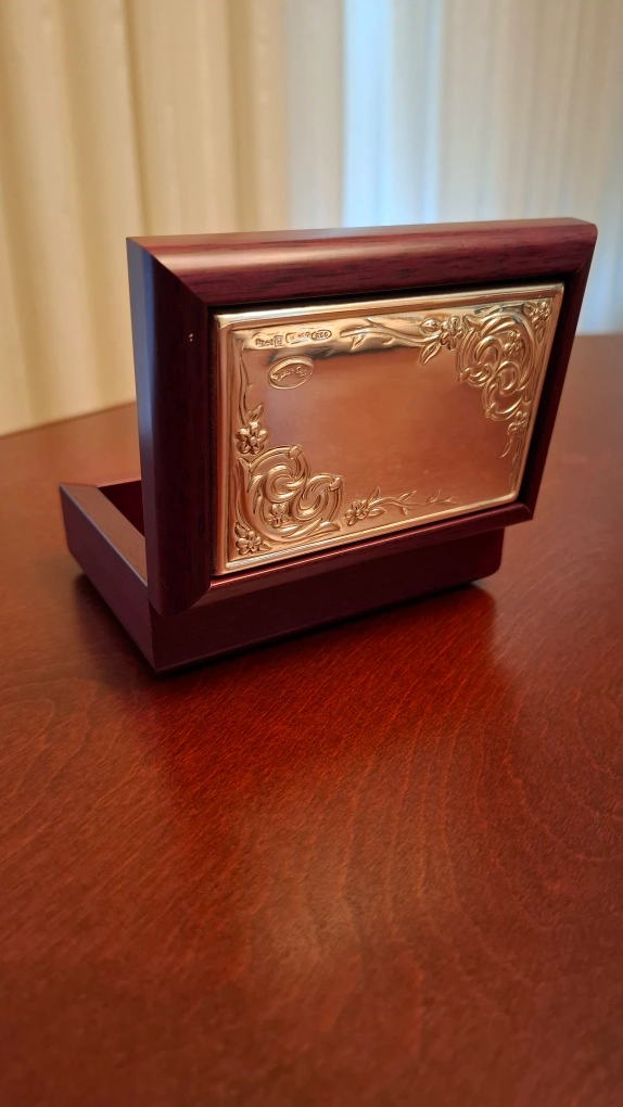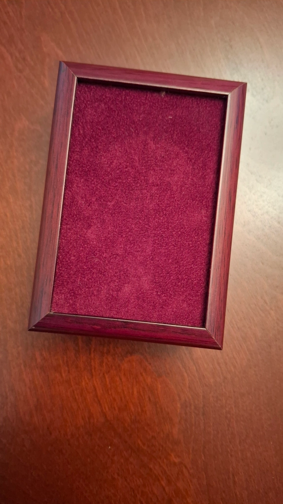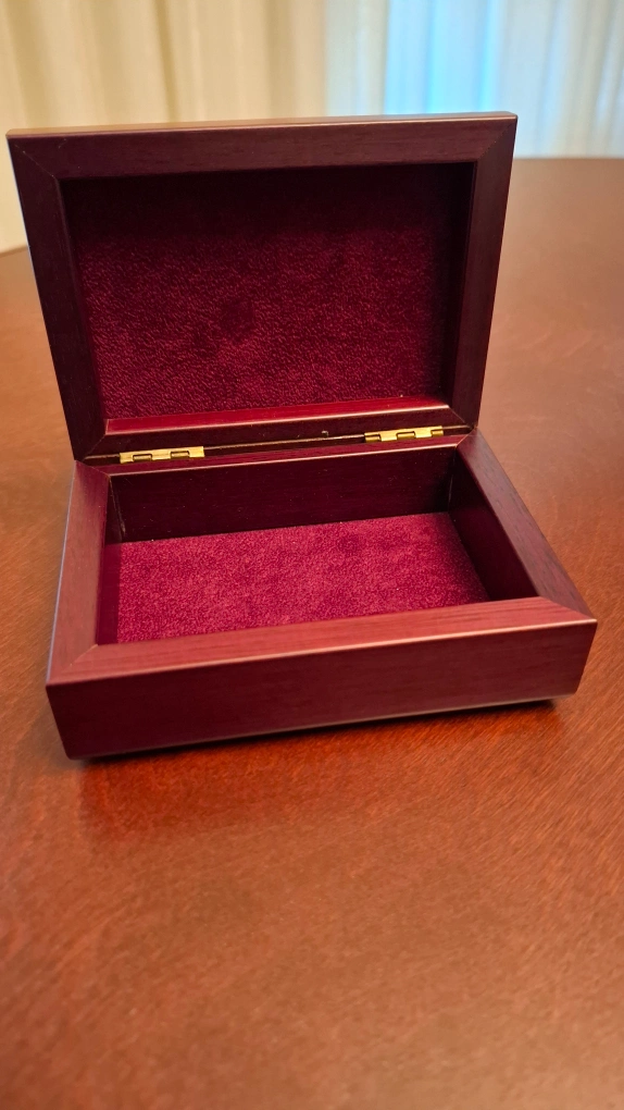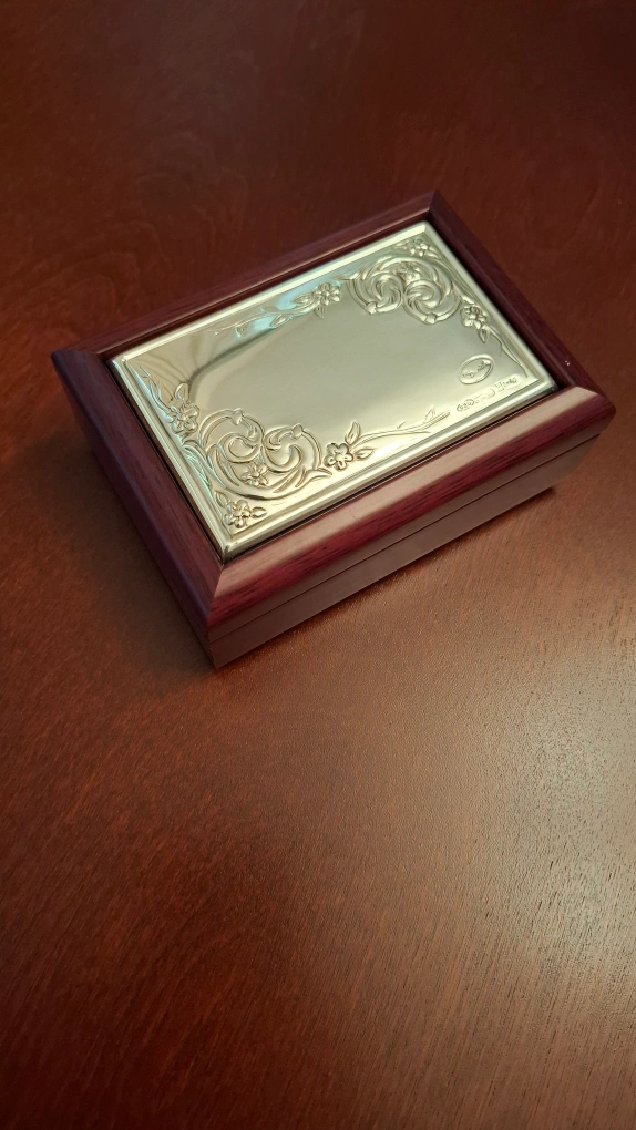 An elegant italian 925 sterling silver-lidded jewelry box. The lid features a beautifully embossed floral design hallmarked and stamped for authenticity. Encased in a rich cherry wood exterior and red velvet-lined interior. Dimensions: 4.5"x3.25"x2"
