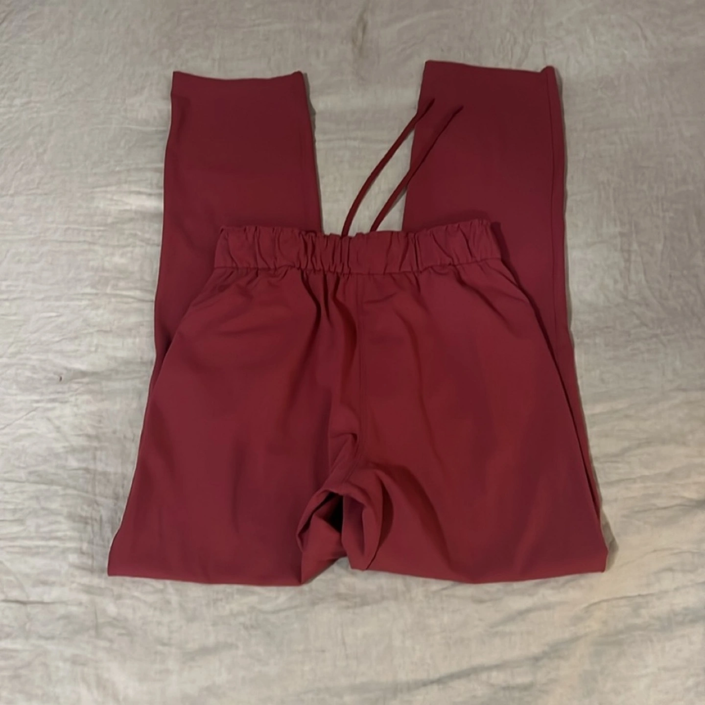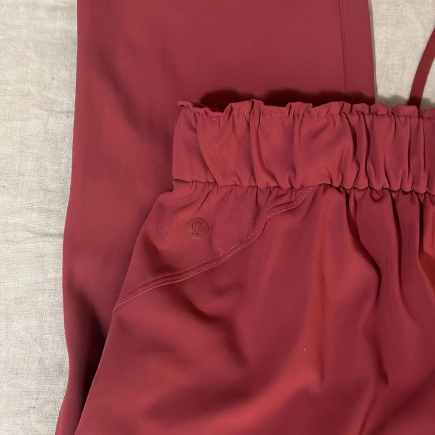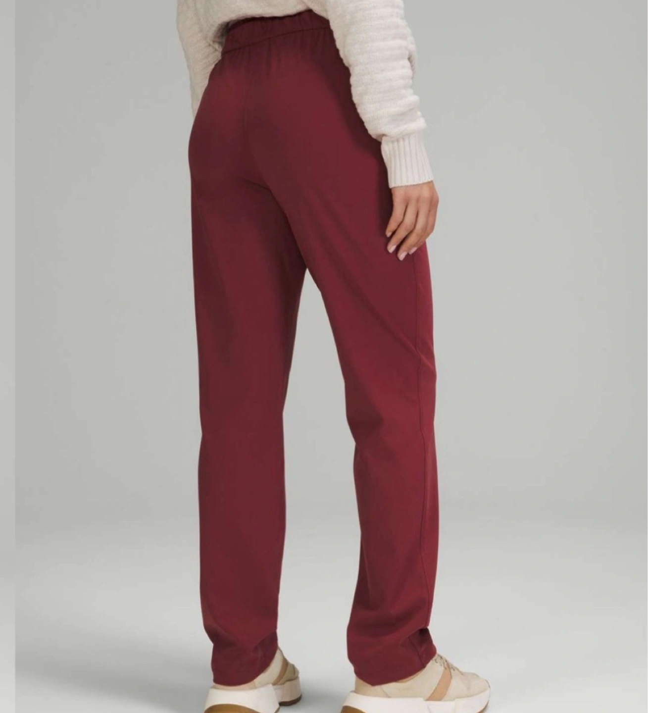 Colour is Mulled Wine, inseam is 31". Great condition. Super comfy like sweatpants but look more structured. Great for a casual office pant. Paid $118 plus tax. Price is firm