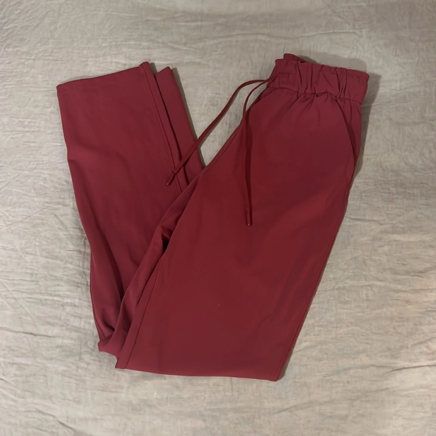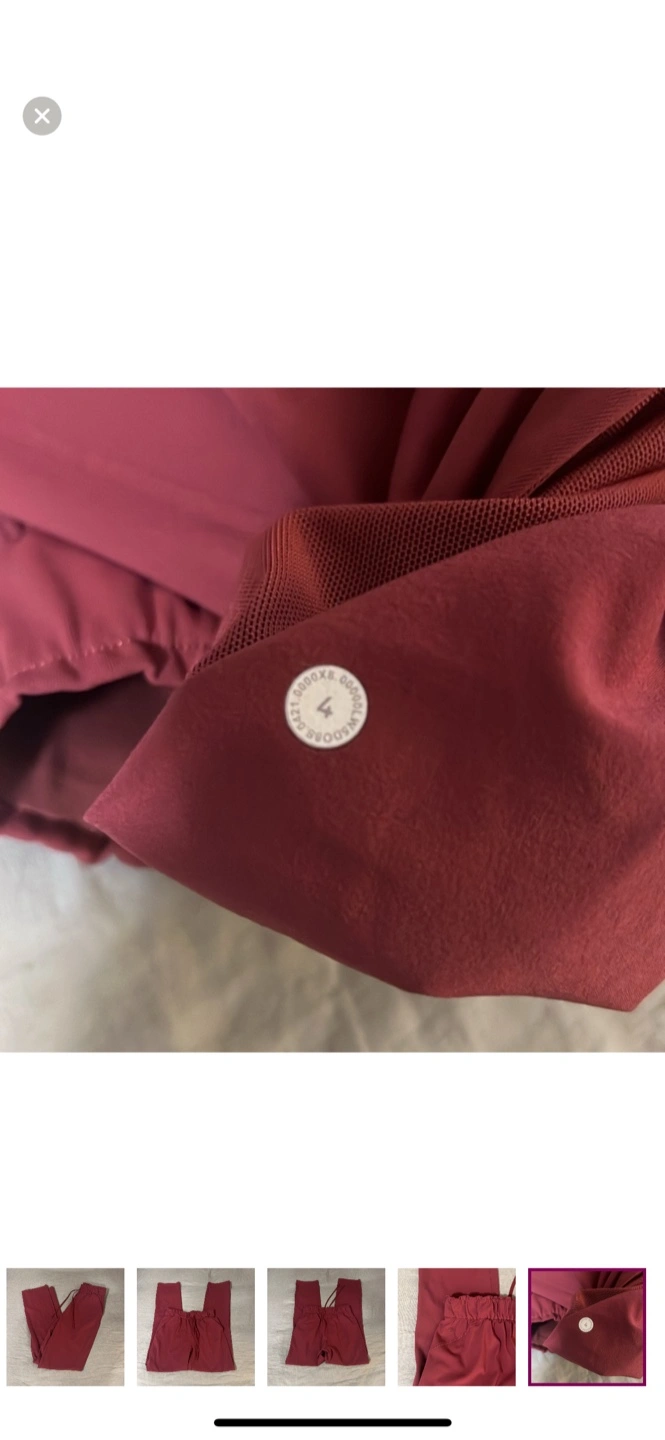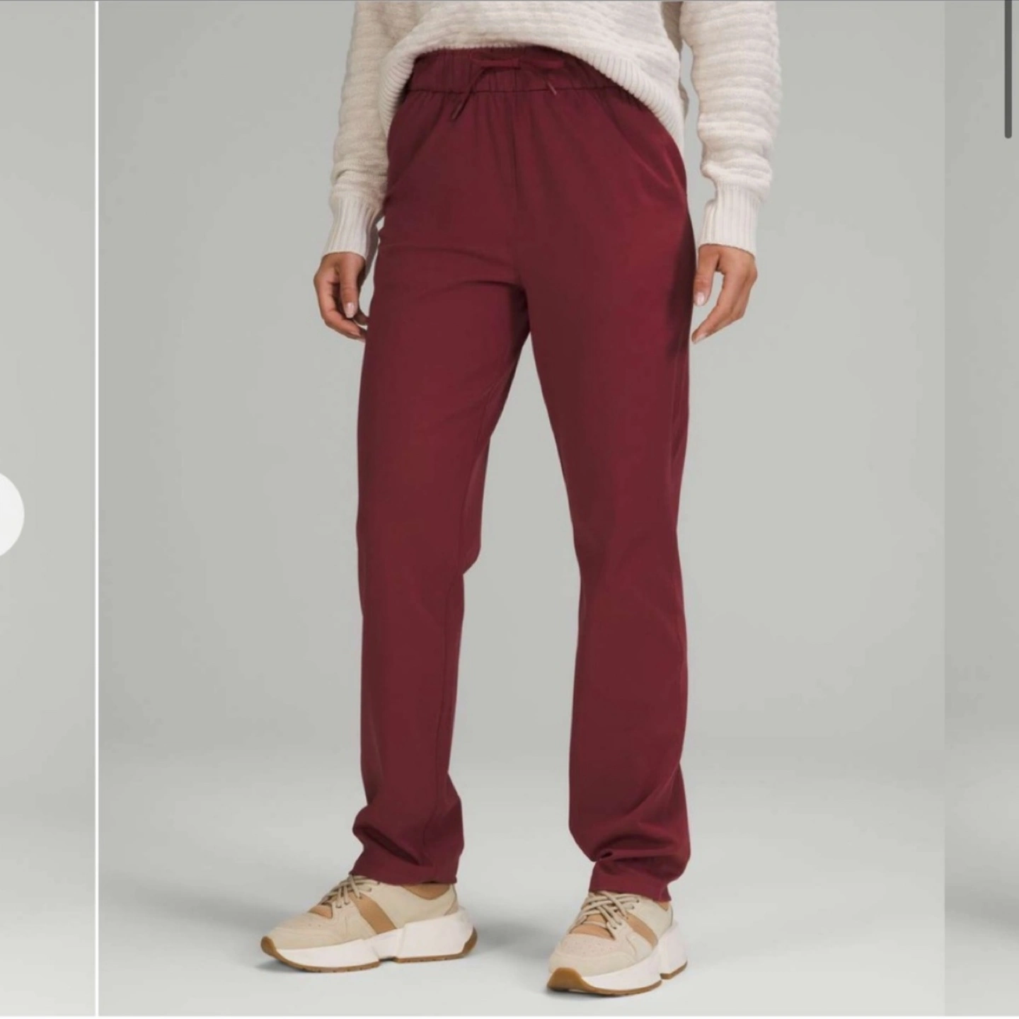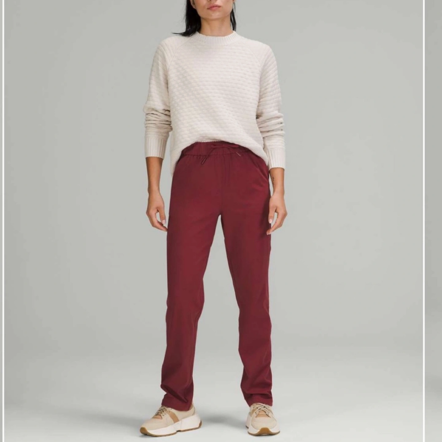 Colour is Mulled Wine, inseam is 31". Great condition. Super comfy like sweatpants but look more structured. Great for a casual office pant. Paid $118 plus tax. Price is firm