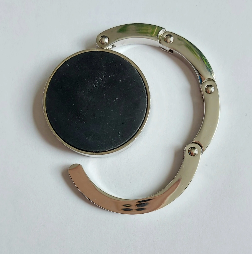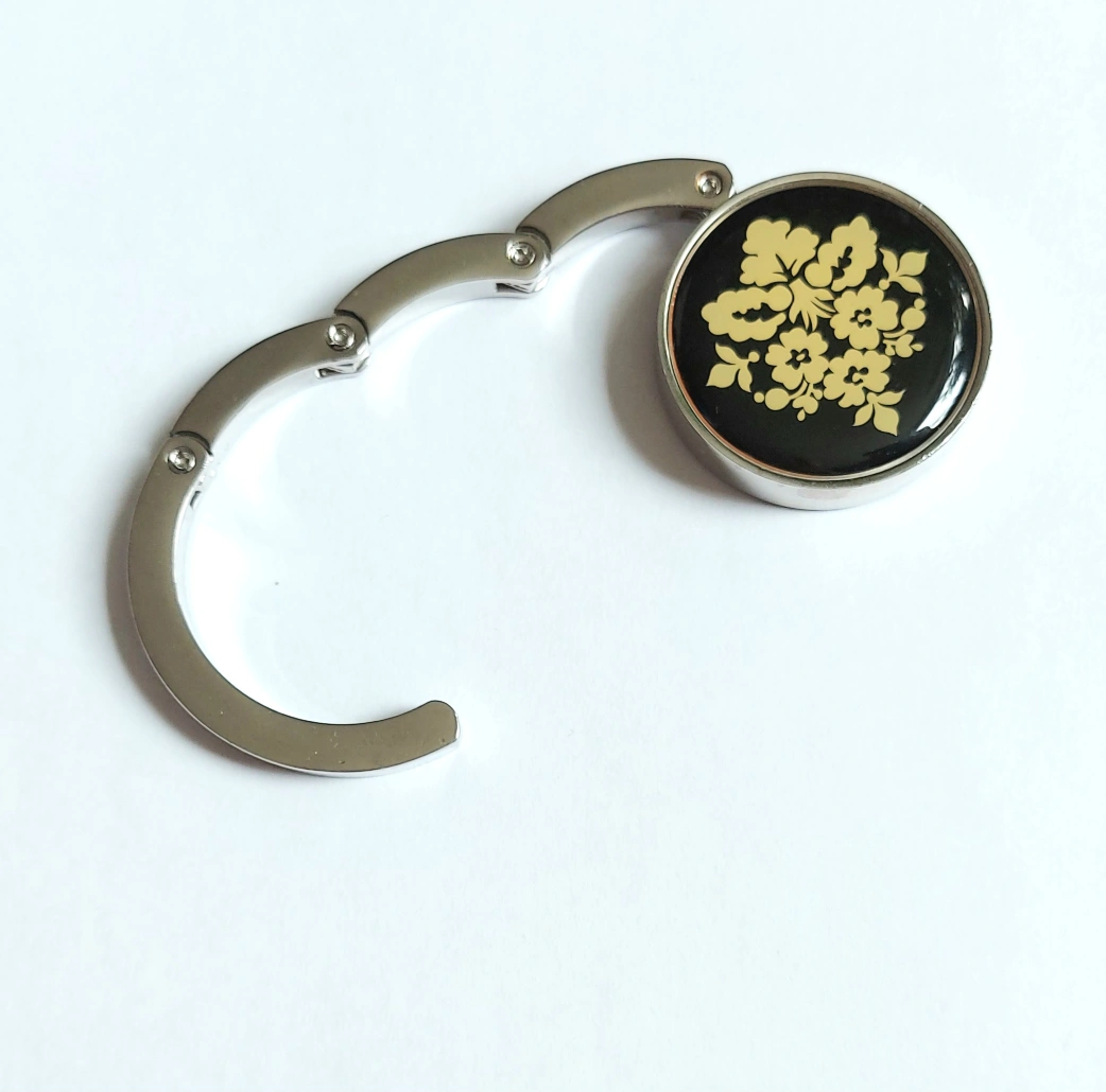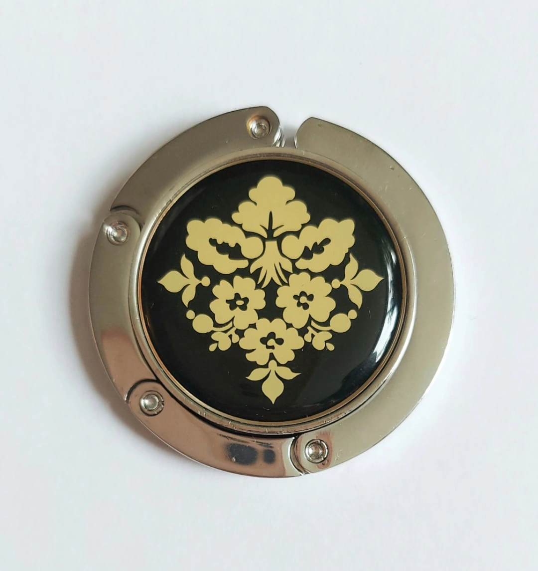 This is a handy, compact purse holder with a black and gold floral design. It's perfect for keeping your bag off the floor when you're out and about. It folds up neatly for easy storage in your purse or bag.