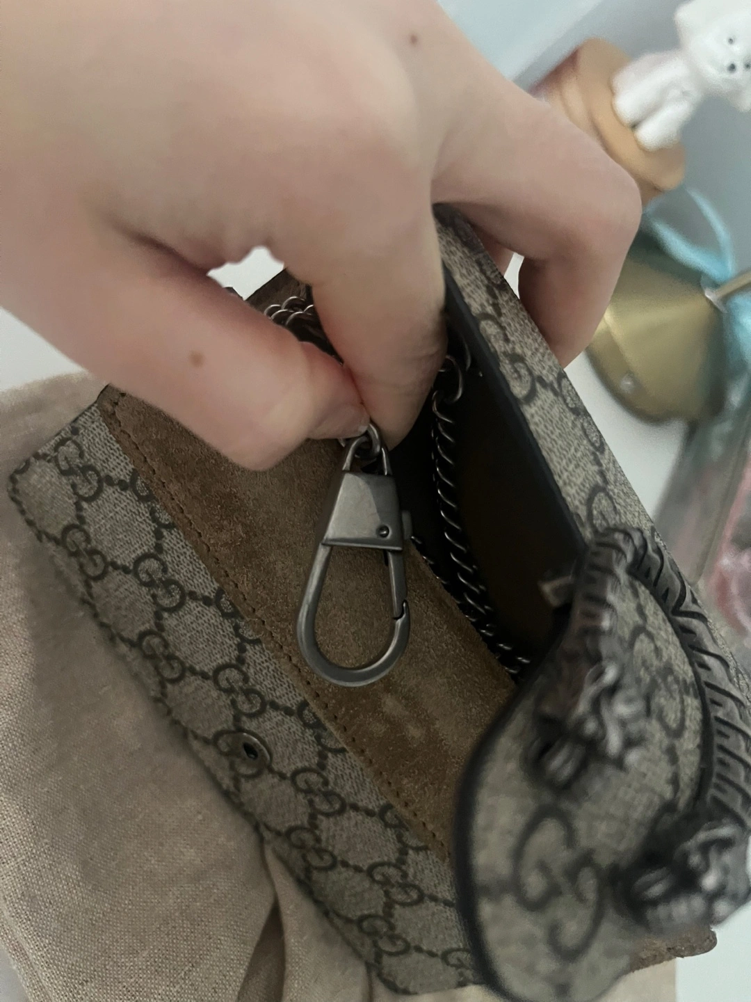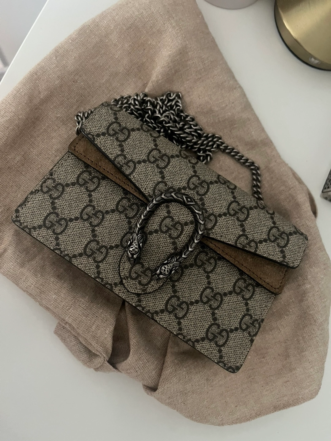 Selling a Gucci Dionysus Super Mini Bag! This cute little bag is perfect for carrying your essentials. It features the iconic GG supreme canvas and the distinctive tiger head closure. The chain strap adds a touch of elegance. It's in great condition (authentic) and ready for a new home!