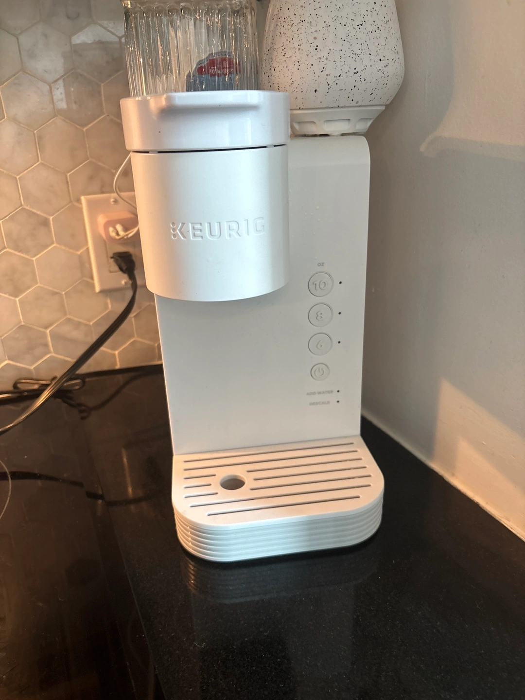 Selling a Keurig K-Mini single serve coffee maker in white! It's in great condition and perfect for small spaces. Brews sizes from 6 to 12 oz. Enjoy a fresh cup of coffee in minutes!