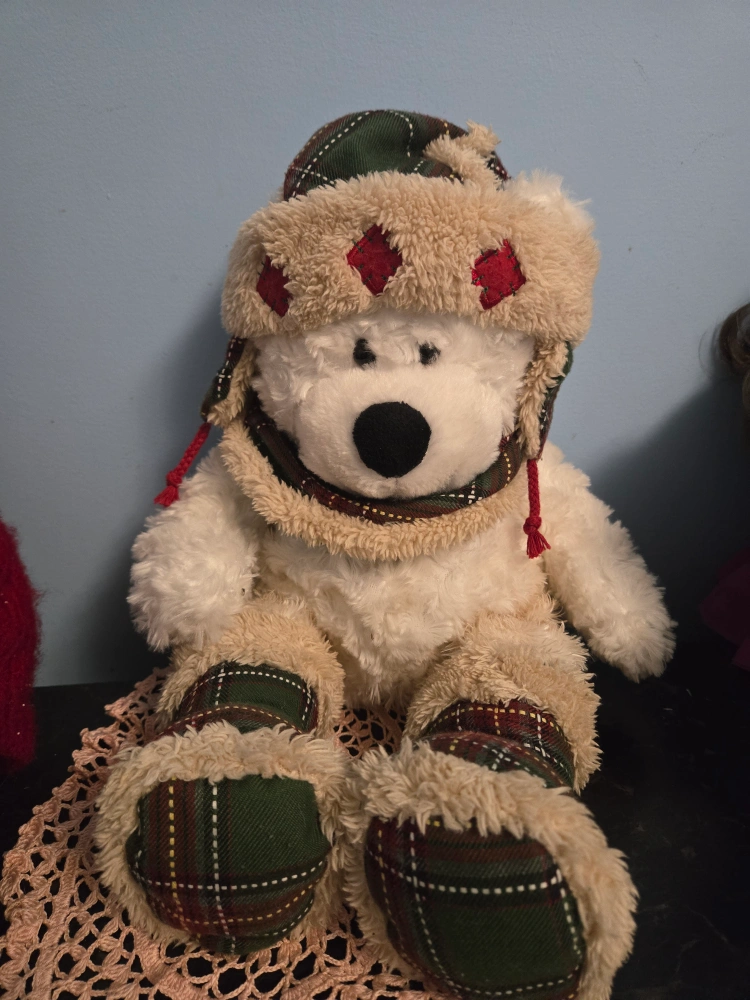 This adorable winter bear plush is ready for a new home! It's wearing a cute hat and scarf, perfect for adding some cozy charm to your space. The bear is in great condition and would make a lovely gift or a sweet addition to any collection