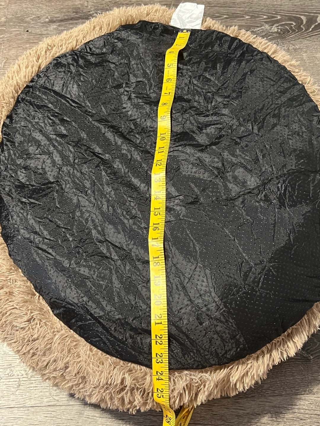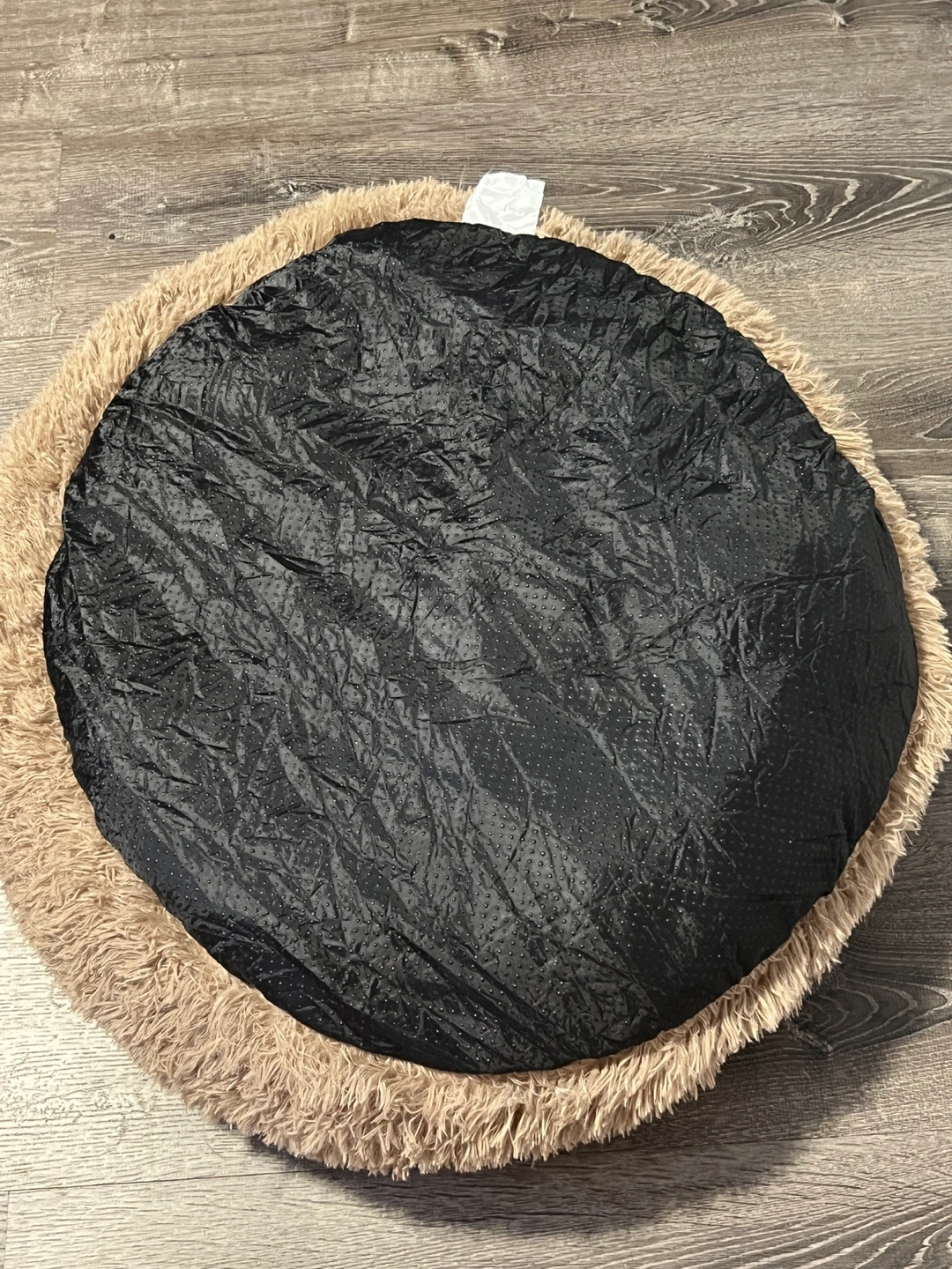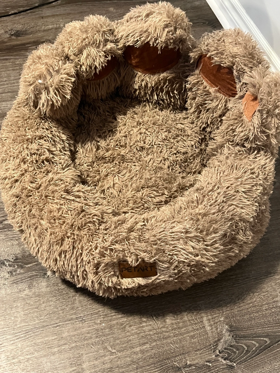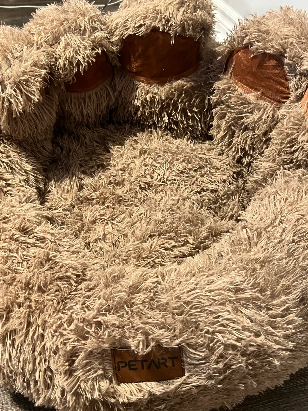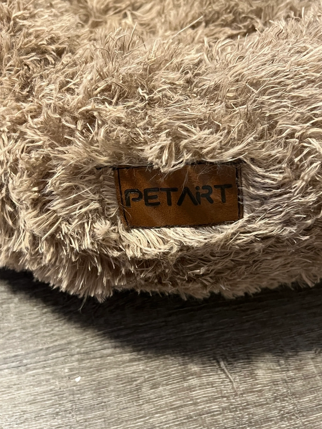 62Your furry friend will love this cozy PetArt pet bed! It's a round, plush bed in a neutral beige colour that will fit perfectly into any room. The bottom is non-slip to keep it in place. The bed measures approximately 24 inches in diameter, providing plenty of space for your pet to curl up and relax. My standard dachshund thinks it’s a toy since there is a paws on the side. From smoke free home.