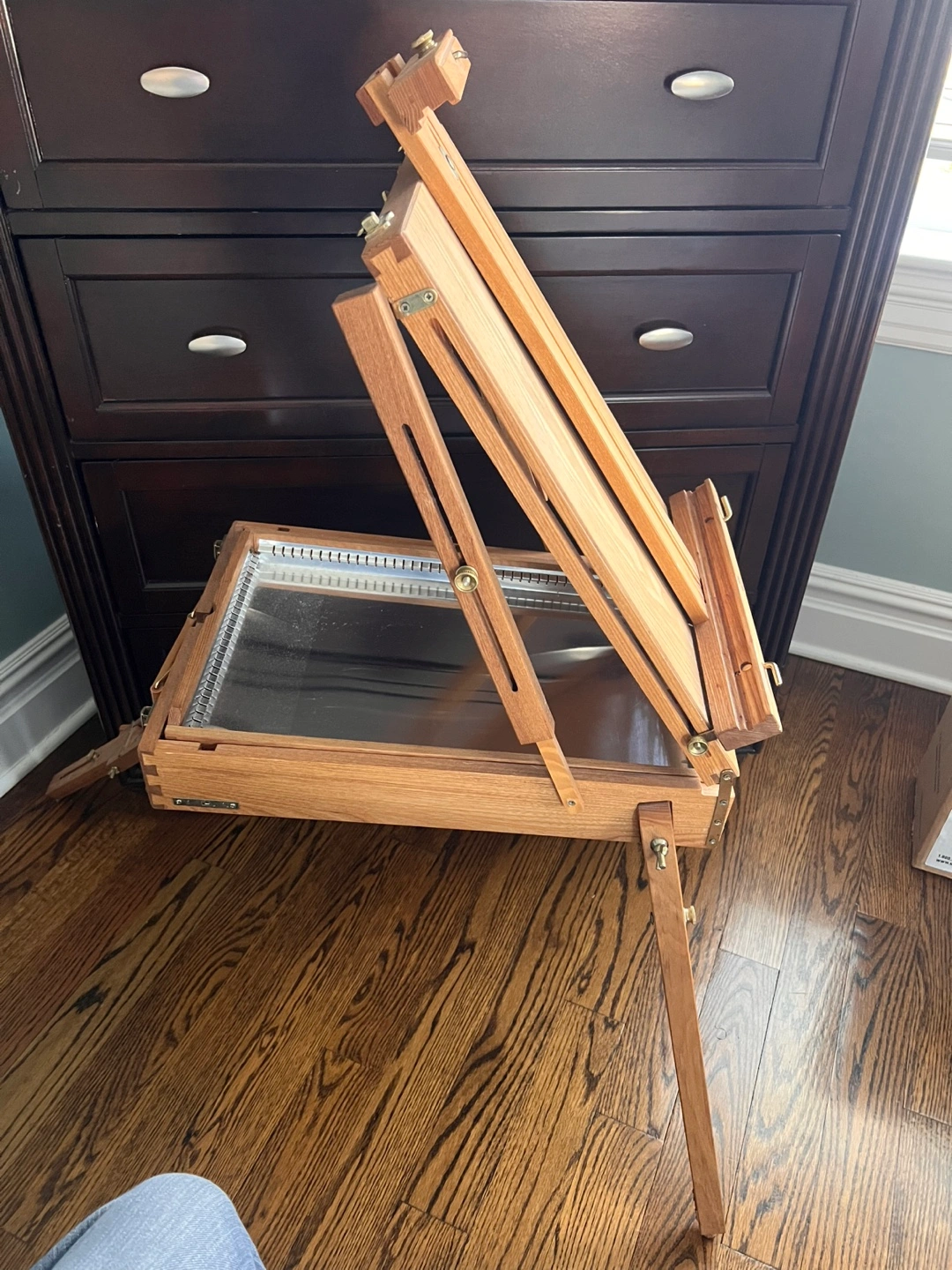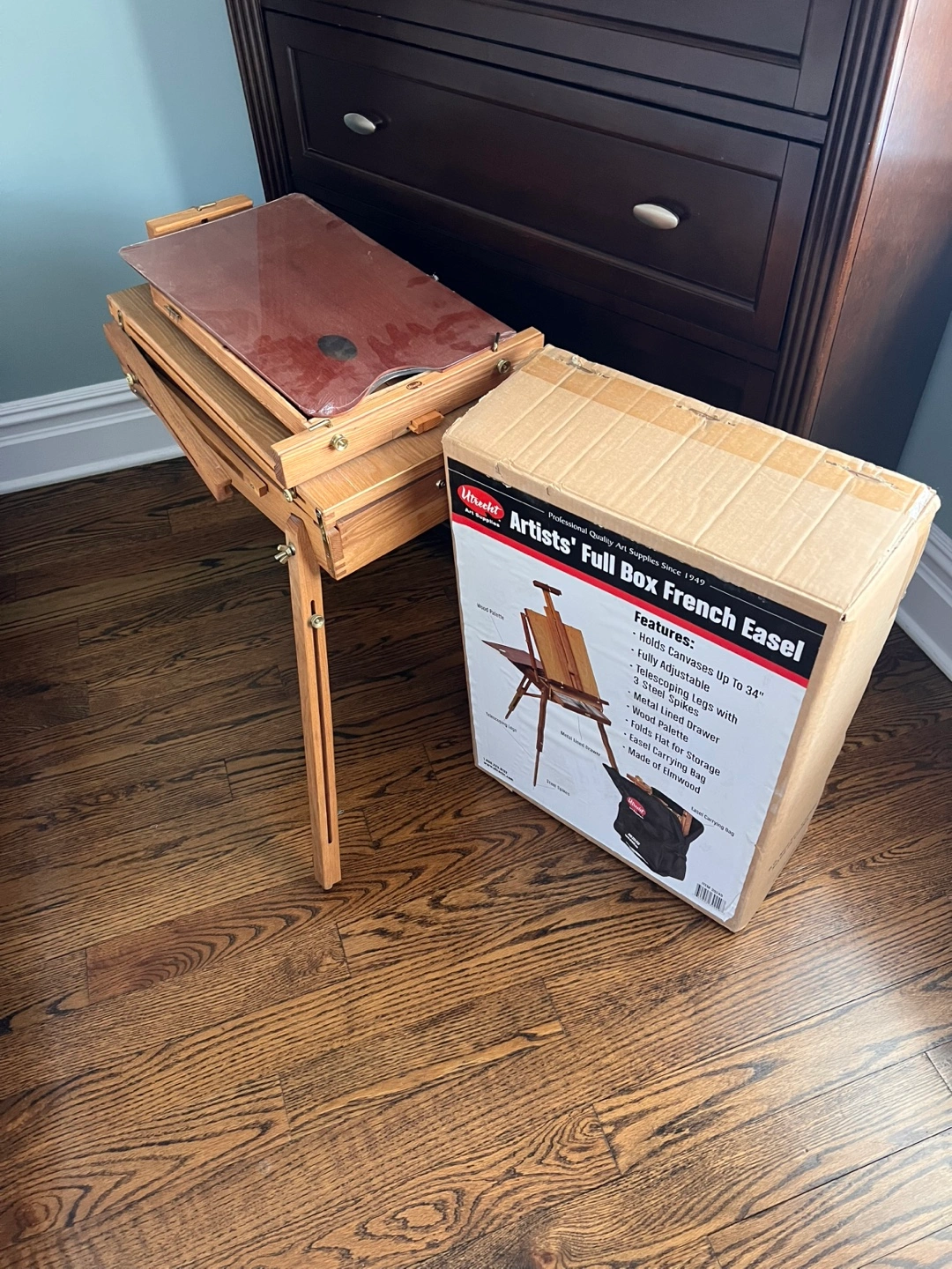 Selling a Utrecht Artists' Full Box French Easel! It holds canvases up to 34" and is fully adjustable. It also features telescoping legs with 3 steel spikes, a metal lined drawer, and a wood palette. It folds flat for storage and includes an easel carrying bag. Made of Elmwood and comes with its original box!