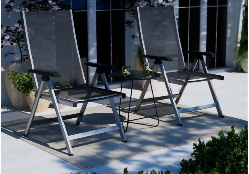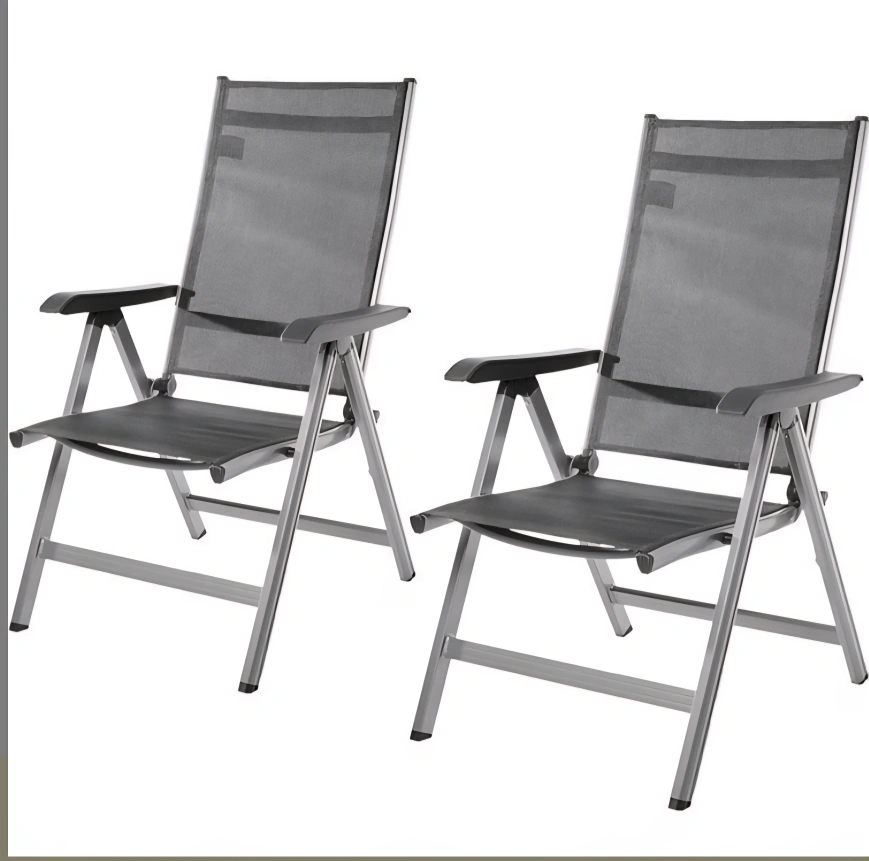 NEW, listing as new as these were used once for approximately 8 hours. Pair of High-Back 5-Position Adjustable and Foldable with Side Arms Patio or Camping chairs. Ventilated mesh with heavy duty frame.