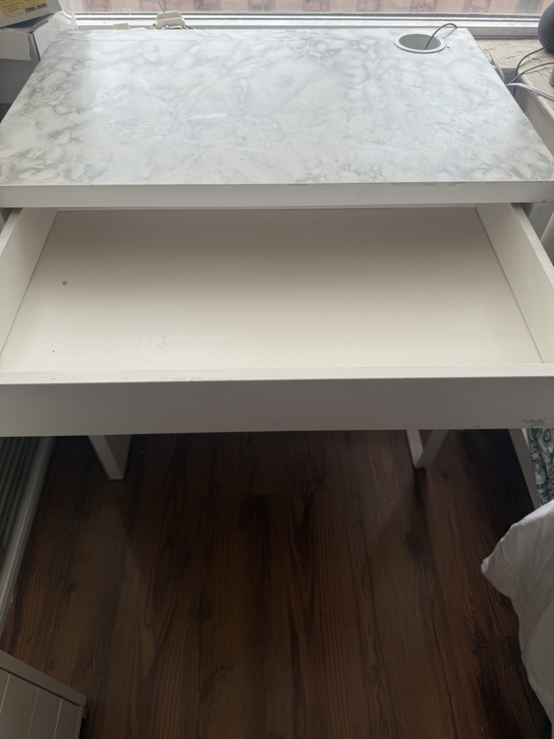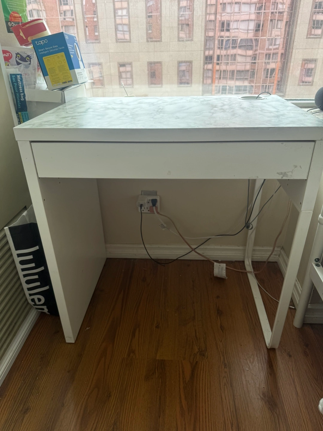 Selling a white desk with a drawer. It's perfect for a small space or as a student desk. The desk has a clean, simple design that will fit into any room. There are some signs of wear and tear.