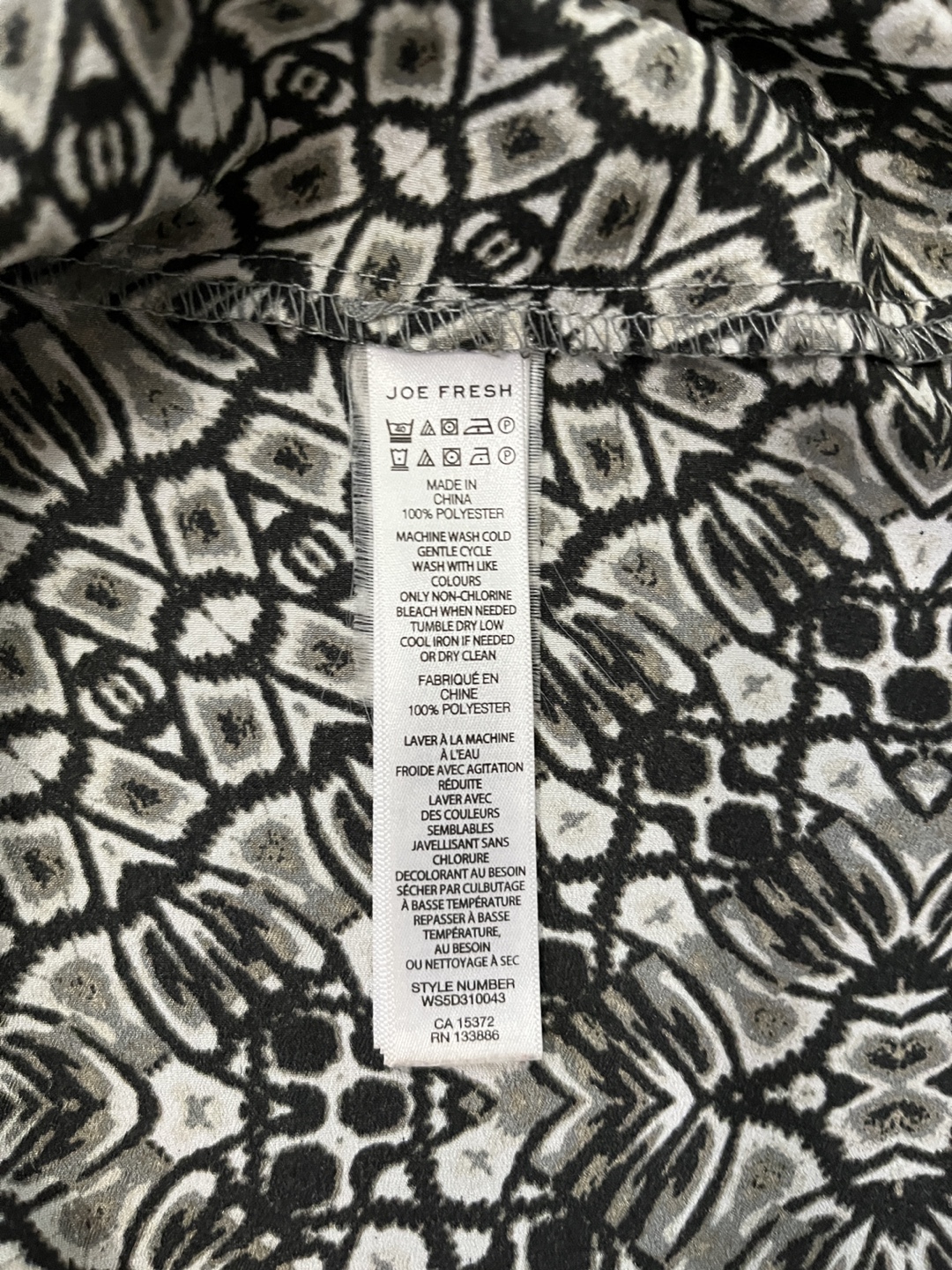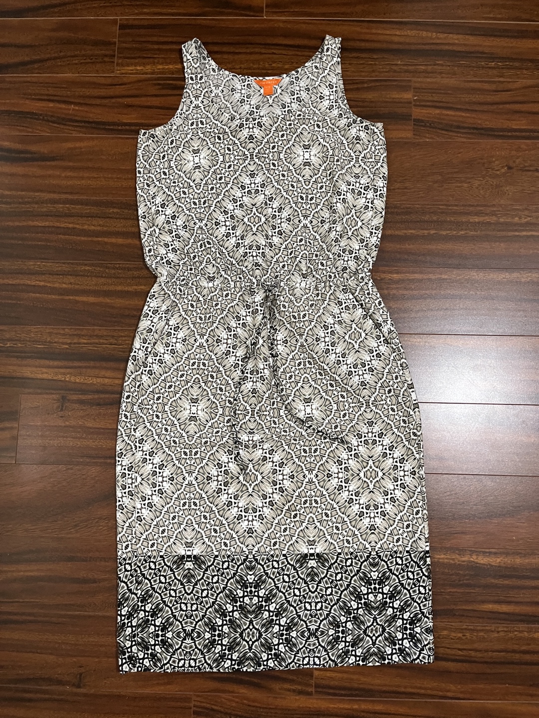 Joe Fresh dress, women’s small. Geometric tile pattern in black and taupe. Sleeveless cut with adjustable drawstring waist. Super easy to style, machine washable and comfy. Great for summer errands, work or weekend plans.