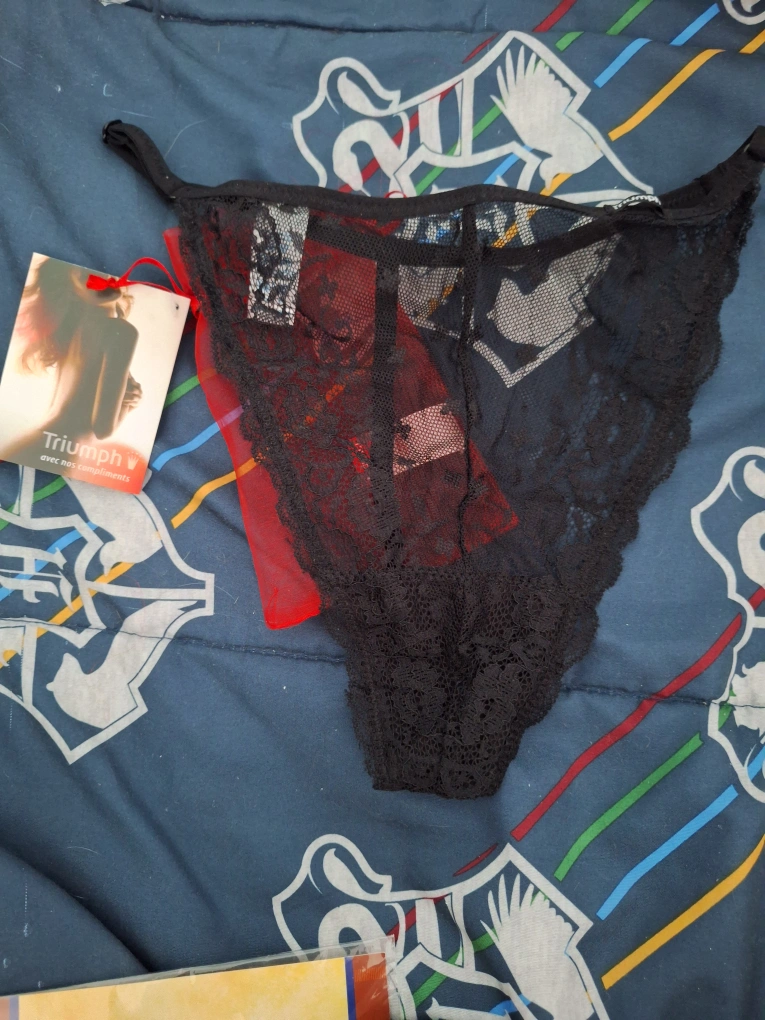 Selling a pair of Triumph black lace panties. They feature a delicate lace design with red accents. Perfect for adding a touch of elegance to your lingerie collection