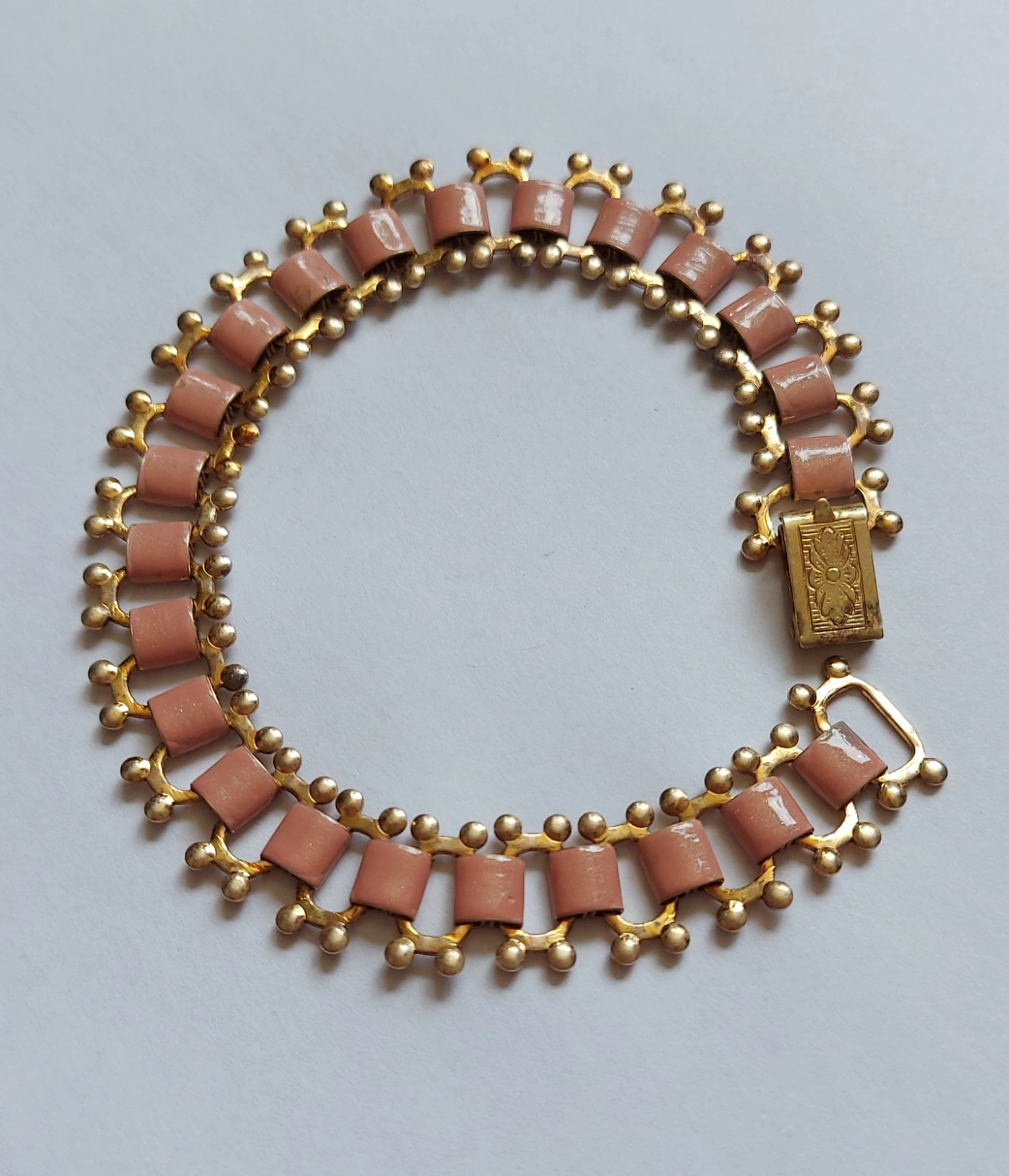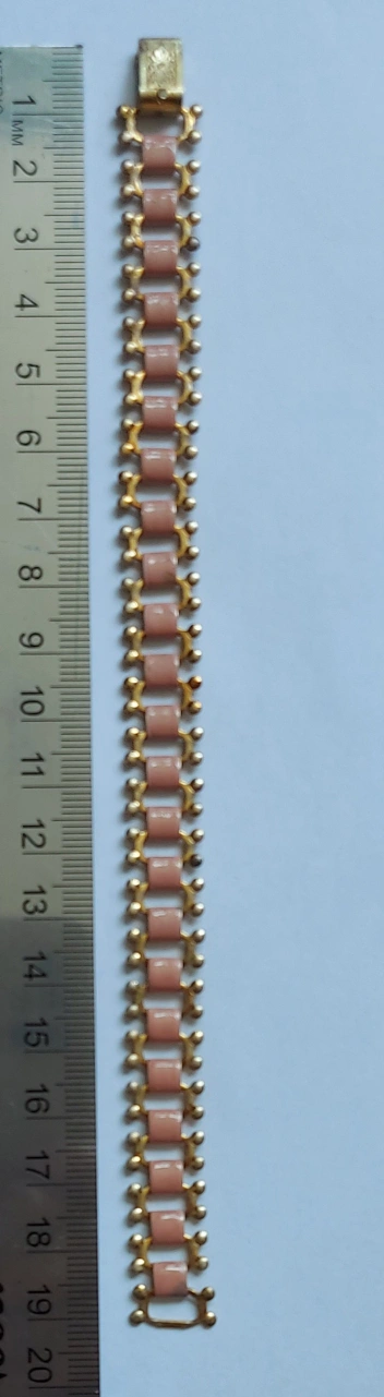 Selling a vintage bracelet with a unique design! It features pink rectangular segments connected by gold-tone beads and links. The clasp is also gold-tone and has a decorative design. Shows some signs of wear and tear. 19cm length