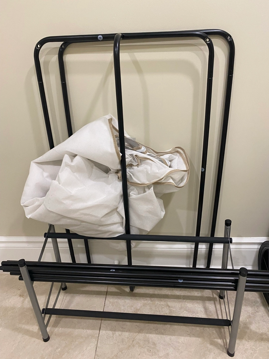 Selling a portable wardrobe with a cover and shoes rack. The frame is black and the cover is a light neutral colour. It's great for adding extra closet space or for temporary storage. Space for shoes. Easy to assemble and disassemble as needed. I can deliver if near subway for 3.20.