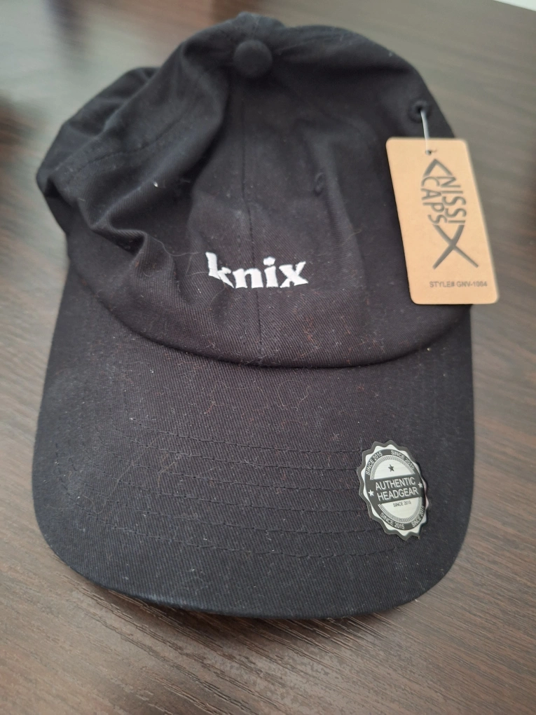 Selling a black baseball cap from Knix! It's in great condition and features the Knix logo embroidered on the front. This authentic headgear is a stylish and comfortable accessory for any casual outfit