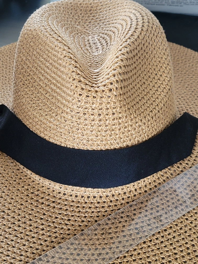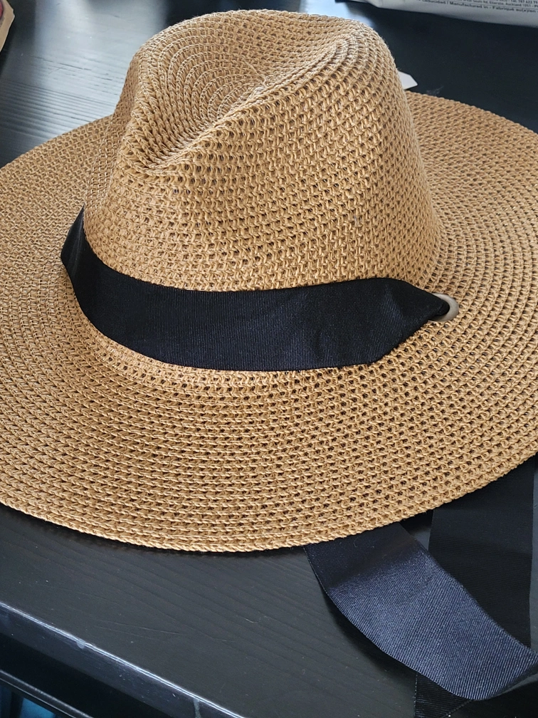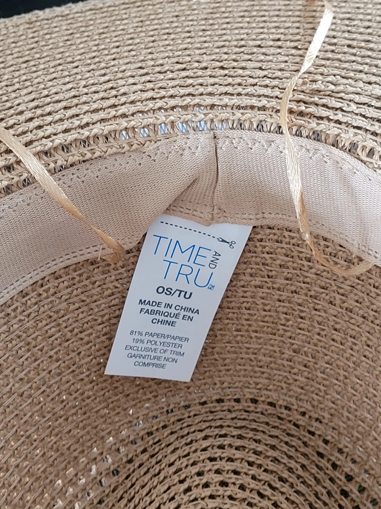 1000+Selling a Time and Tru straw hat! It's a stylish accessory for sunny days. The hat features a black ribbon detail and is made of 81% paper and 19% polyester. It is new with tags and ready for a new home! interior ribbon for sizing and exterior ribbon for windy days.