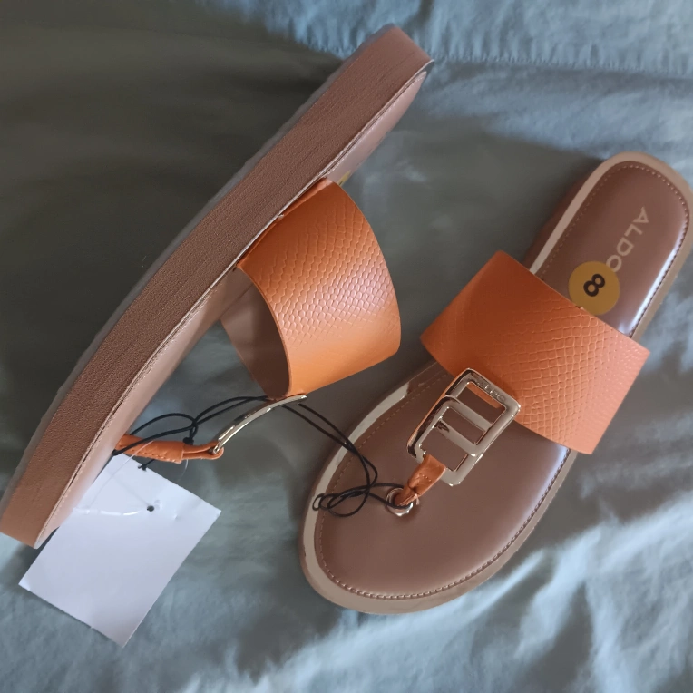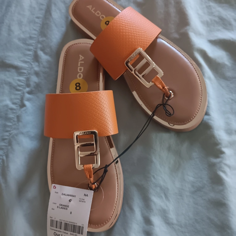 These are new ALDO Daliahillaa1 sandals in a vibrant orange color! They are a size 8. The tag shows a comparison value of $40.00. These stylish sandals are ready for a new home! fit is a tad narrow.